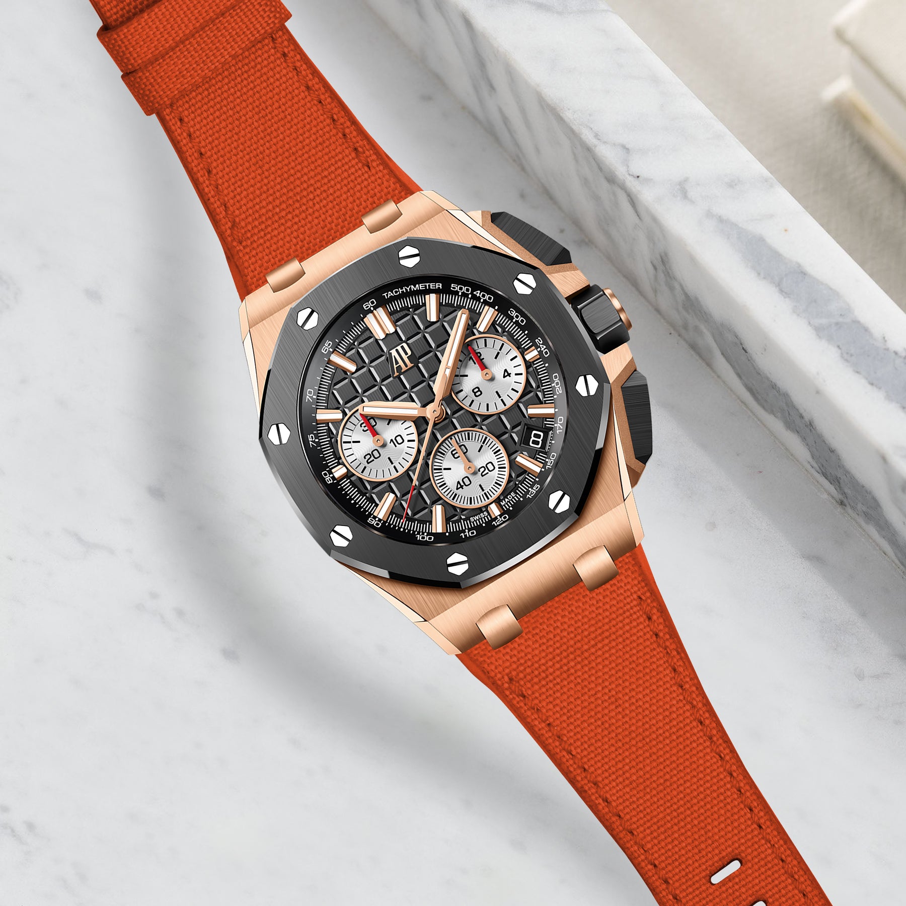 Our Canvas straps are for the explorer inside you. The new canvas watch straps are crafted from highly durable canvas material which is very resistant to water, stain and easy to clean. Perfect for year-round-wear, no matter your location ensuring that you'll experience extreme comfort from the moment you mount it on your wrist. Coming in a wide range of canvas colours material endowed with a new design of Audemars Piguet Royal Oak Offshore 43mm & 42mm.