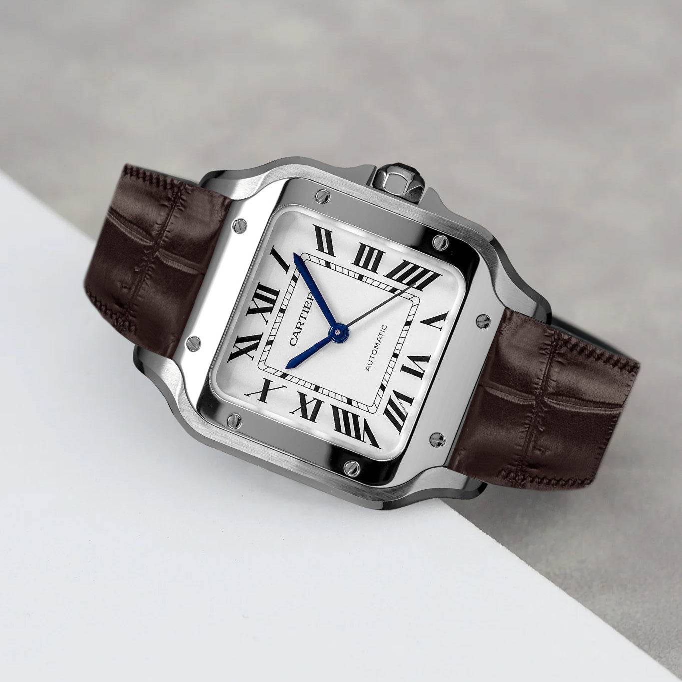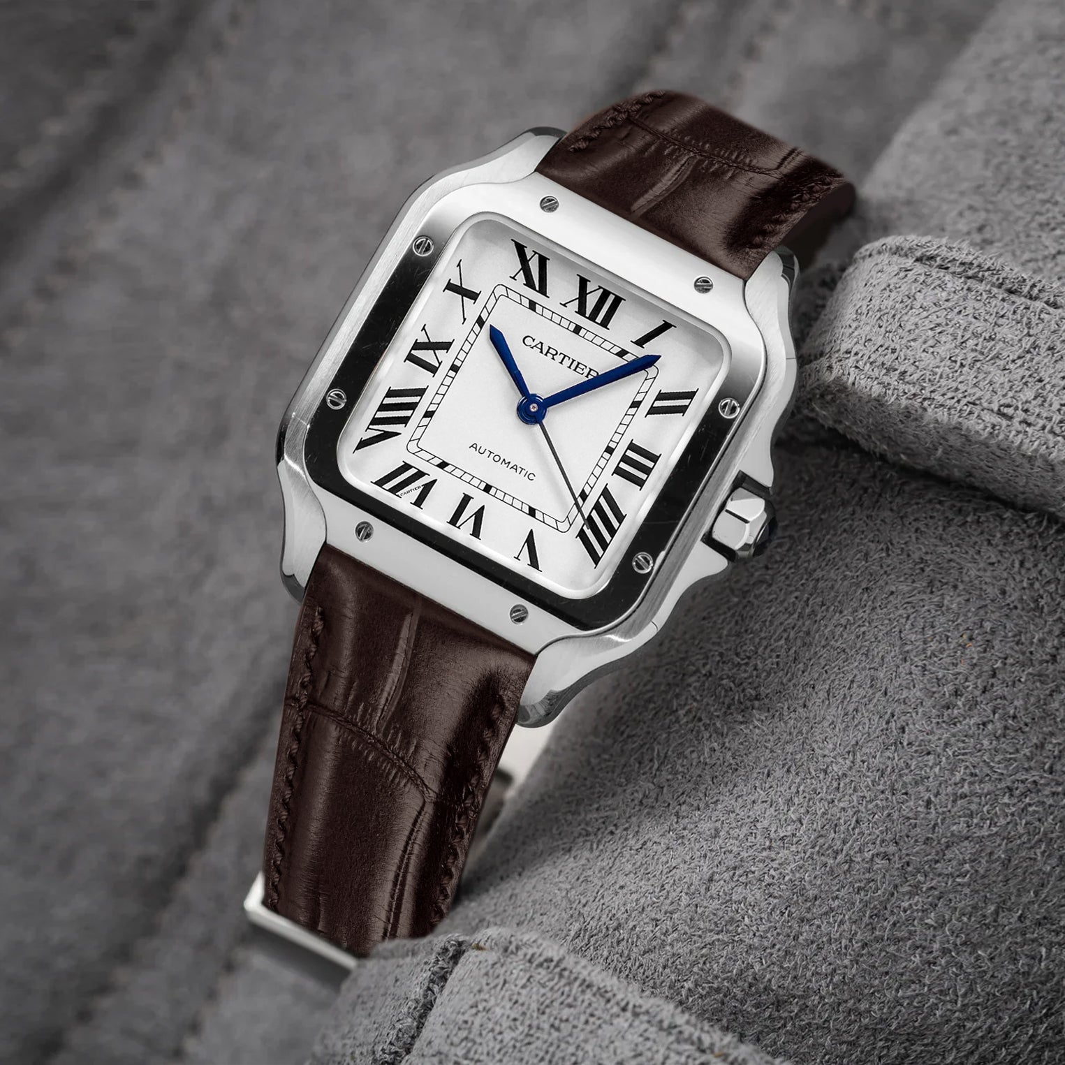 Previously, you could only get these straps through Cartier. After research & development we are now proud to be able to offer integrated straps that is a perfect fit for the Cartier Santos de Cartier from Medium, Large and also XL versions too.