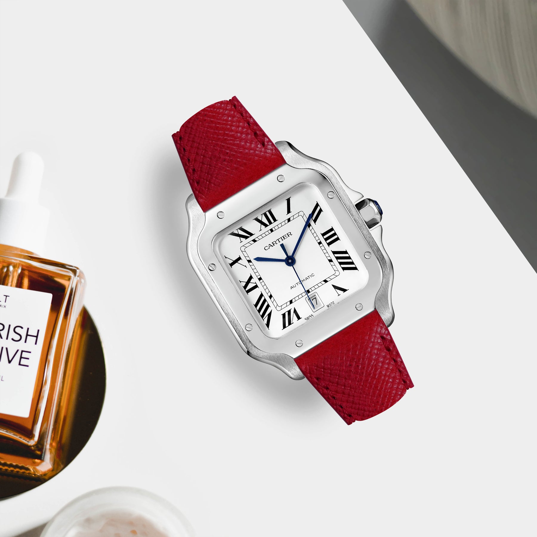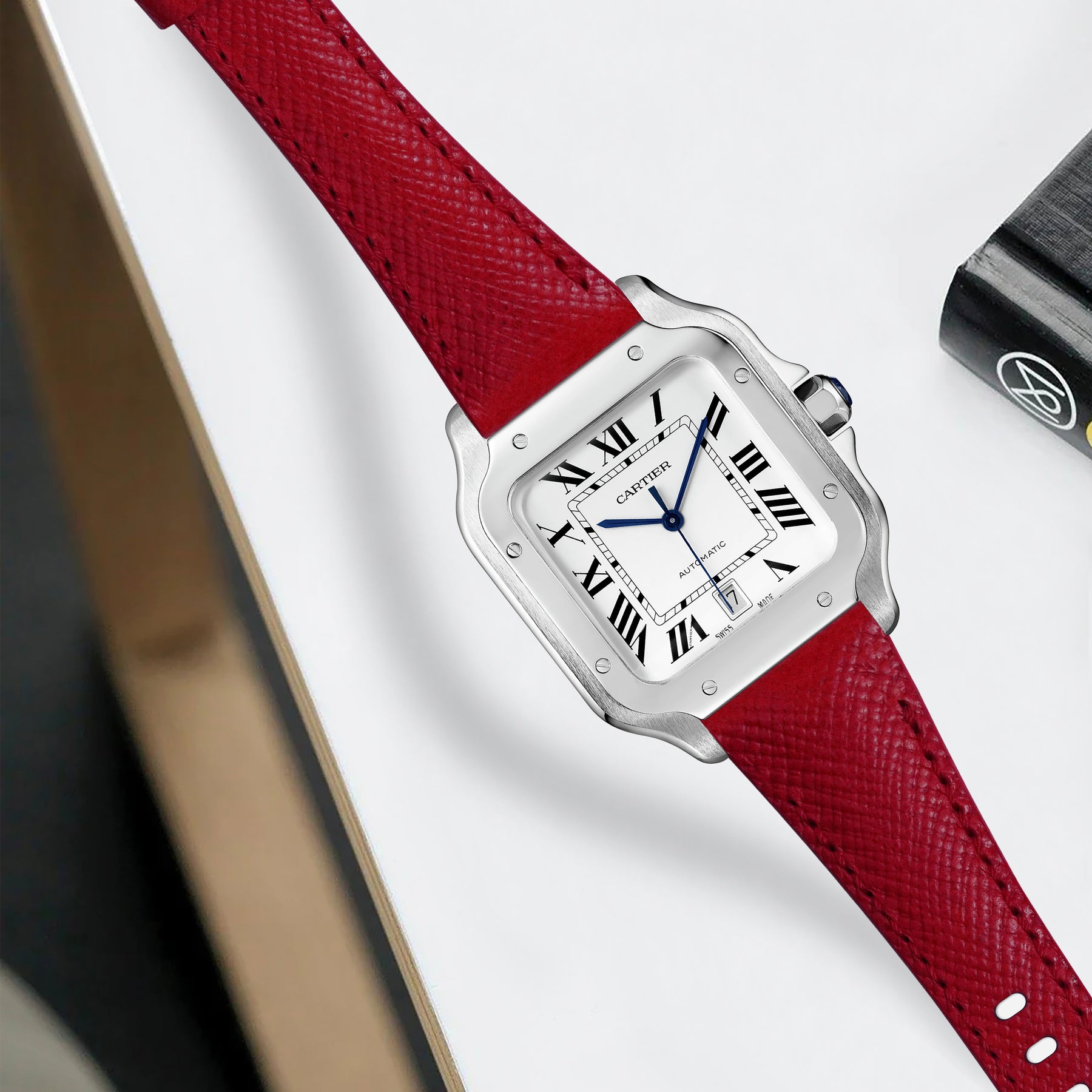 These straps offers a different look to your Santos with the fine flat hatch grain which gives this a two tone effect. Crafted from vegetable tanned bovine double shoulders leather with refined hatch grain pattern that adds a touch of intrigue and modern flair to your wristwear. It will withstand years of use showing a significant amount of patina development over time. Choose from a rich color palette inspired by the hues of Italian landscapes from deep tones to vibrant shades, this straps offer a spectrum of options to complement your Cartier Santos and personal style.