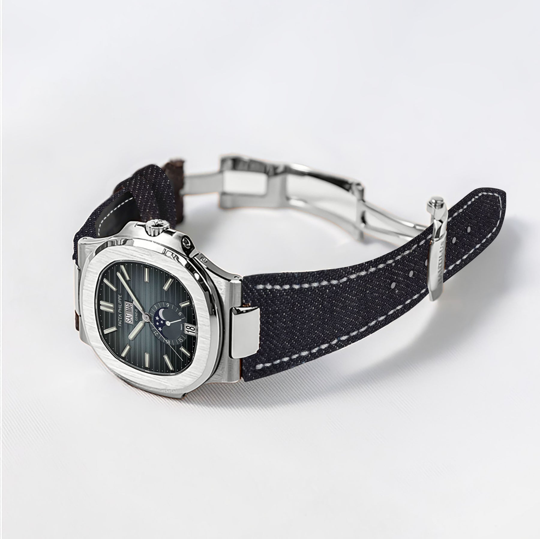 Description : Introducing the new addition to the Patek Philippe - Nautilus collection. Denim Indigo specially designed by our workshop to fit and highlight the nature of your Patek Philippe Nautilus without any lug overhang. With its slim case and classy look, it was a very dressy watch that worked well on a range of straps equiped with metal inserts for more durability.