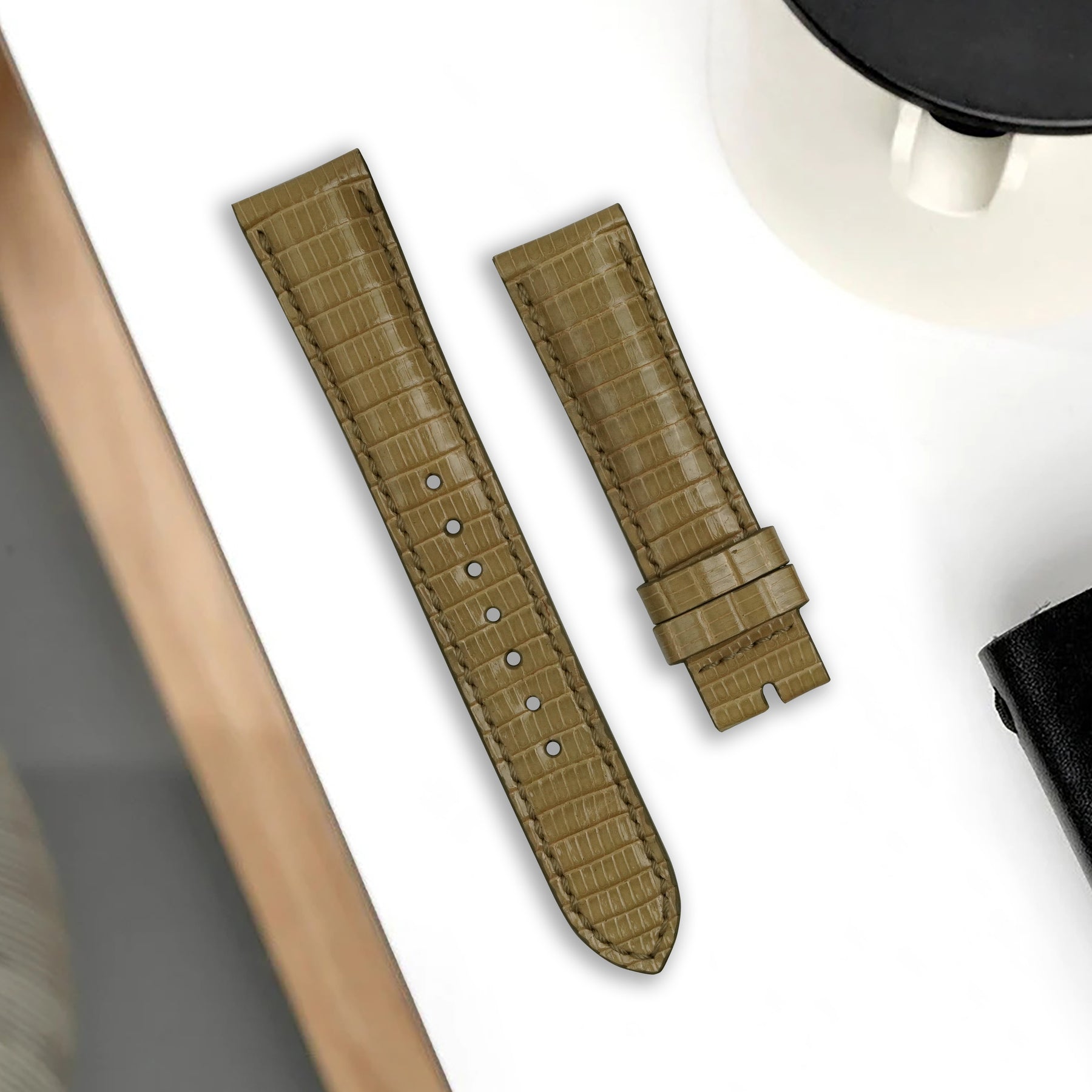Description : Luxurious lizard leather with its typical small scales is manufactured from first-class lizard, tanned with a very special treatment and seamlessly joined to a layer of soft lining leather. That's why each piece of watch strap has unique pattern.