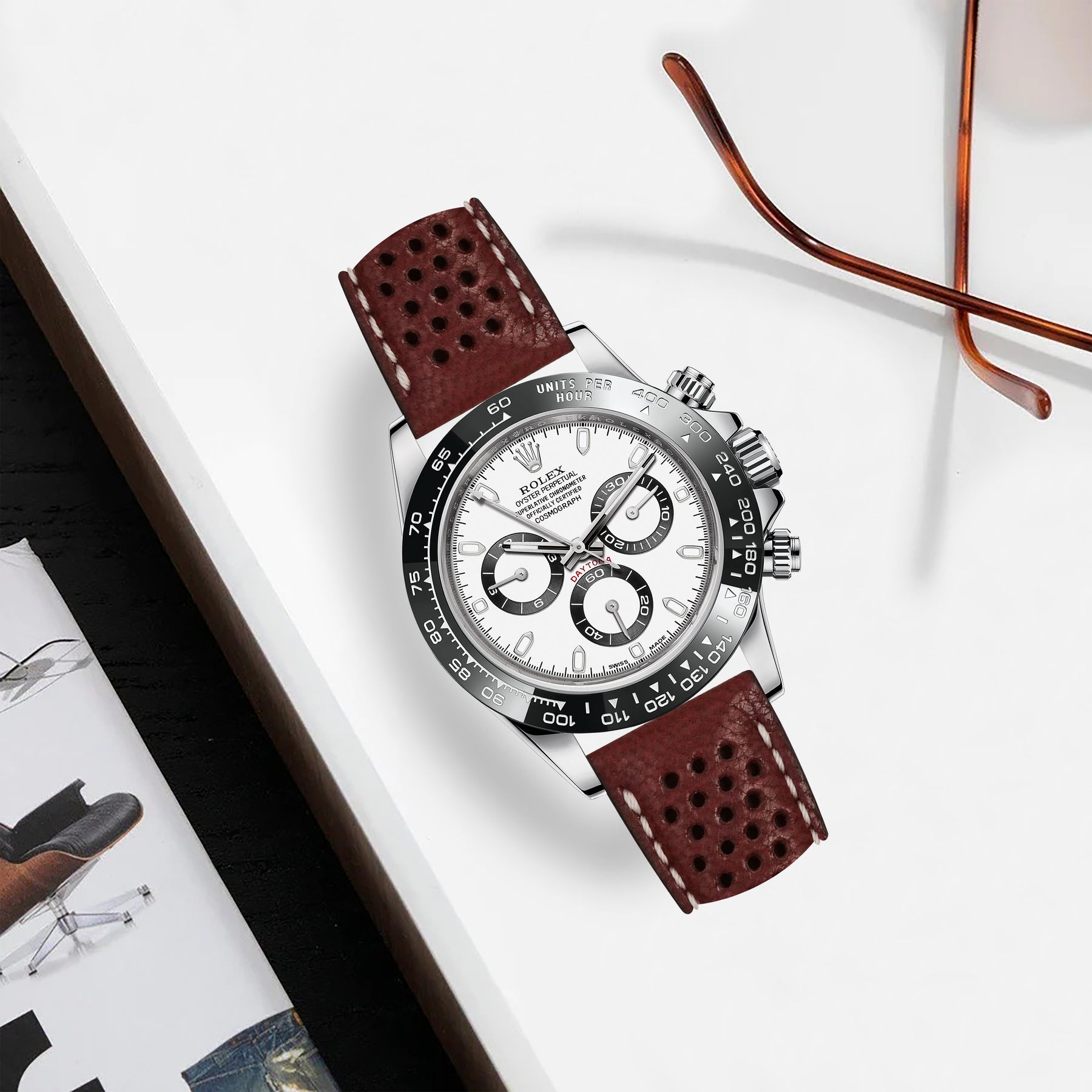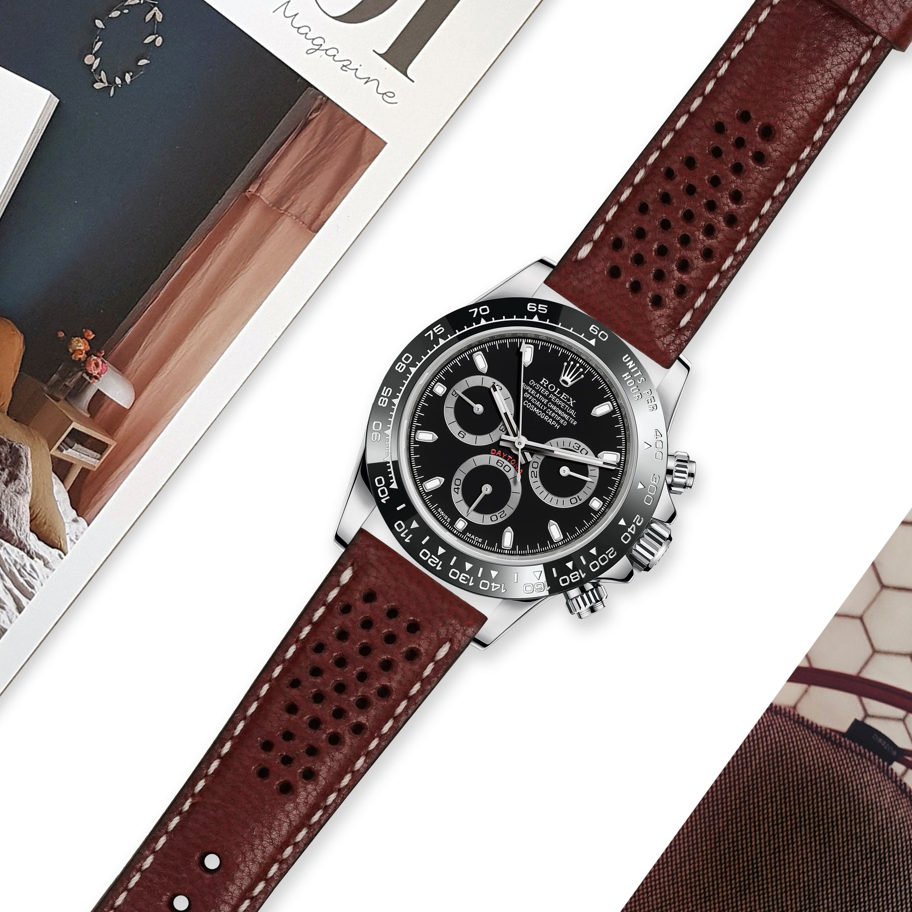 Description : Inspired by the sporty times of the 70’s, these racing straps are an essential to make any sport watch look even cooler. The holes make the strap lighter and more breathable, ideal for warm conditions where you want the comfy feel of a leather strap but don’t want the whole leather feel.