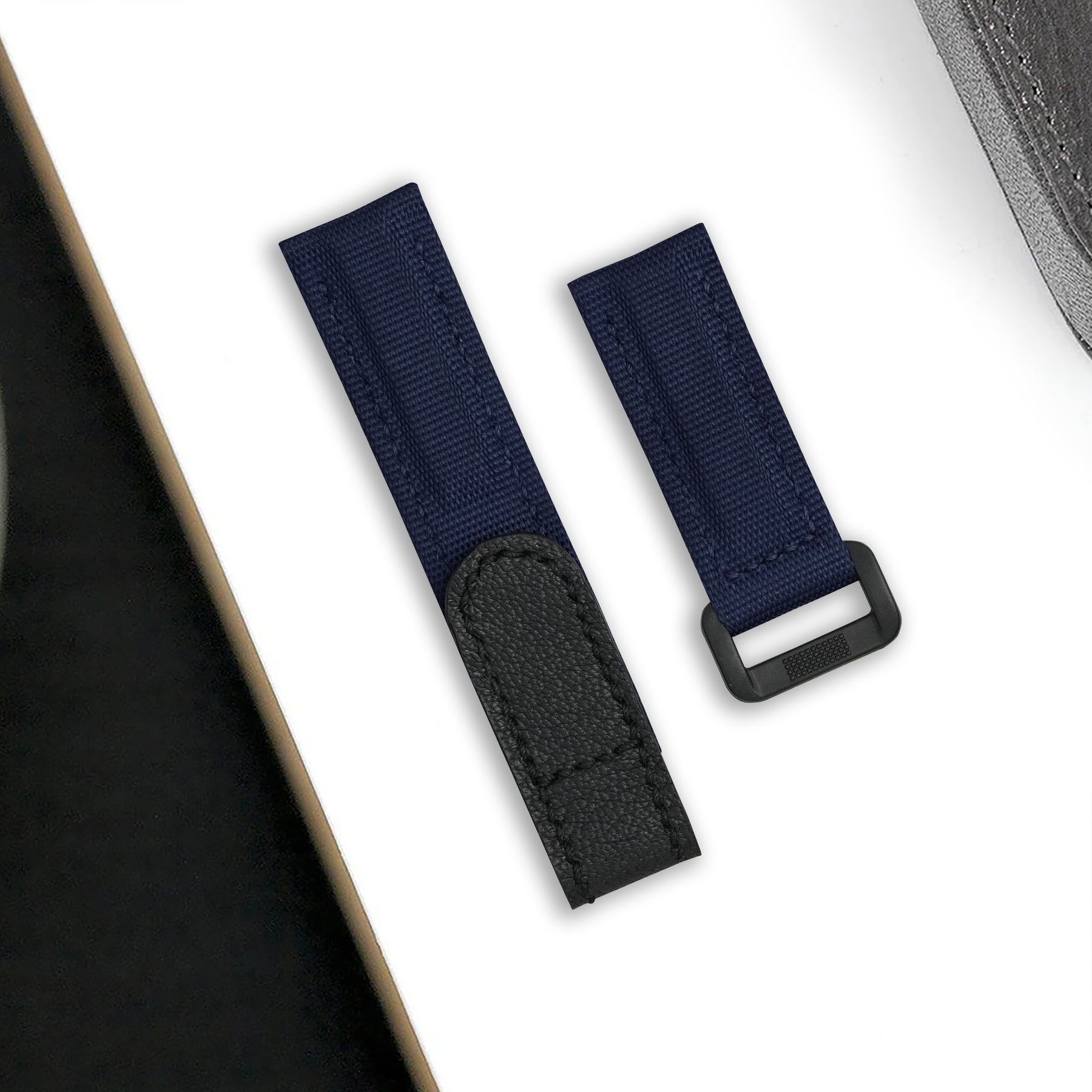 Material : Double-layered, stitched, durable Canvas leather strap in Navy Blue with an adjustable hook and loop velcro closure in Calf leather Black. Also the soft hypoallergenic leather lining for exceptional all-day comfort, and durability.