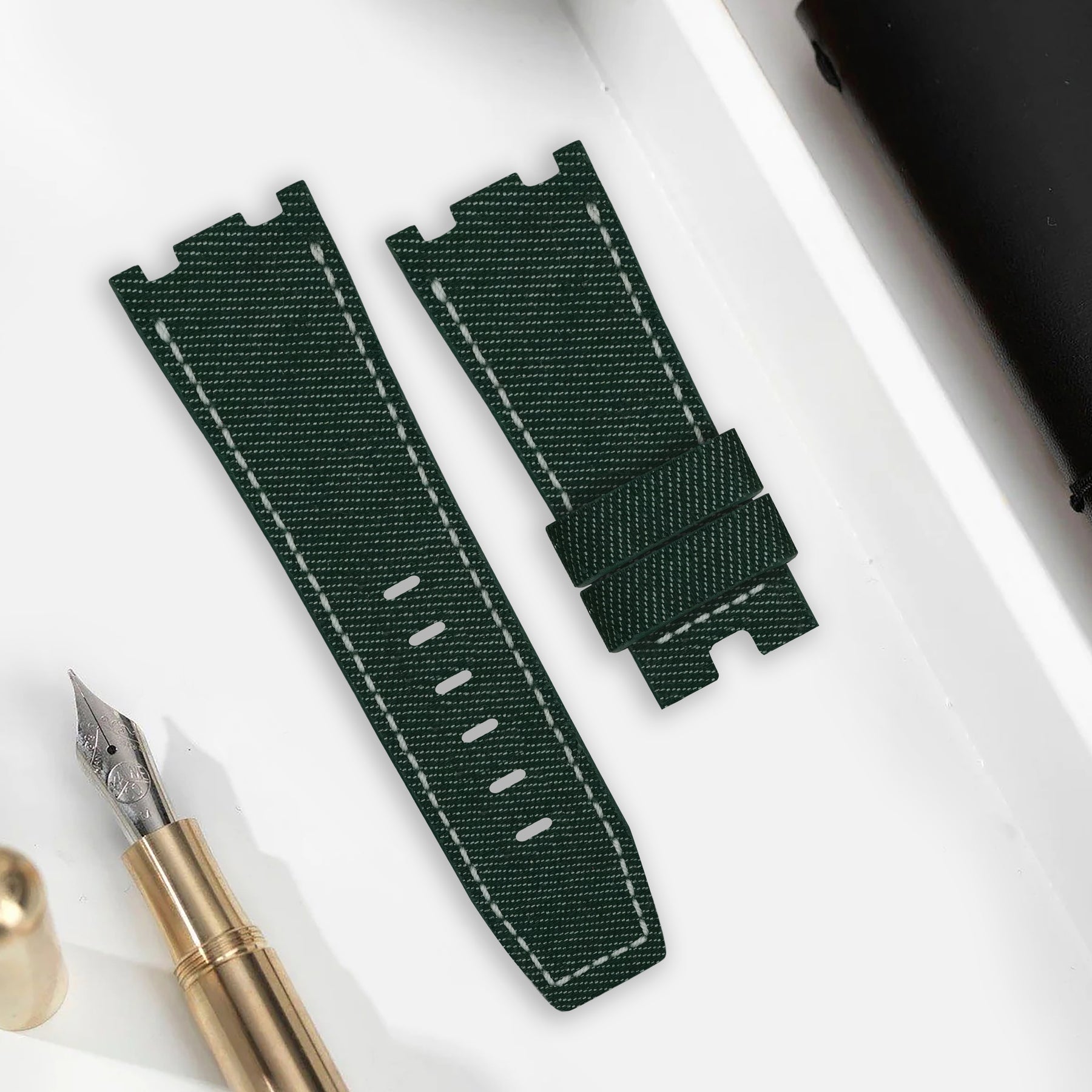 Japanese Denim Brewster Green brings contrast and clarity to your wrist. We use original Selvedge Denim from Japan’s most prestigious and renowned mills. It is woven on rare and slow antique looms to produce exceptional and fascinating textures for straps. Beyond its unique yarn combination, the denim's tight weave, stiff texture, pronounced twill lines and slightly coarse yarns create an exquisite surface structure and marbling effects with wear.