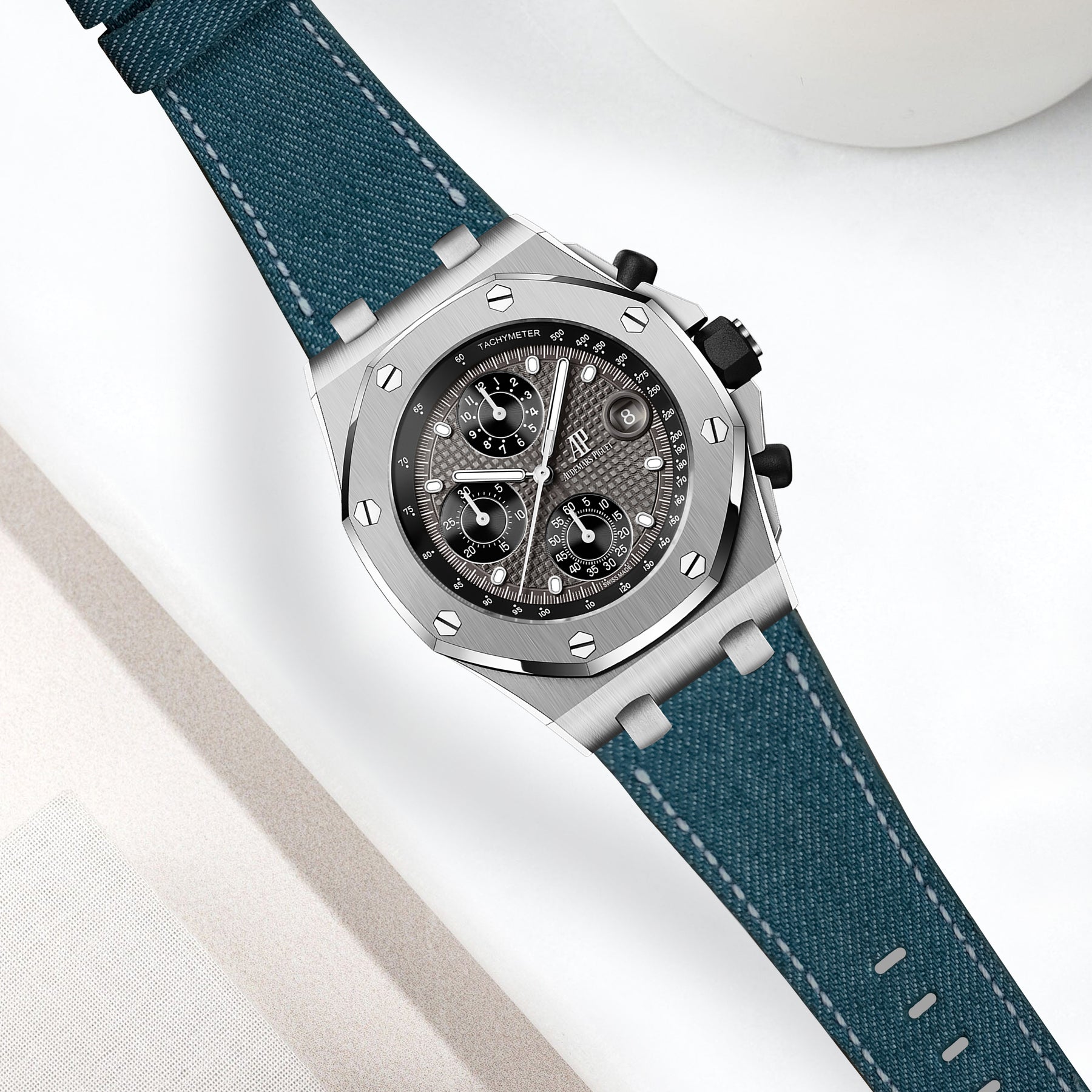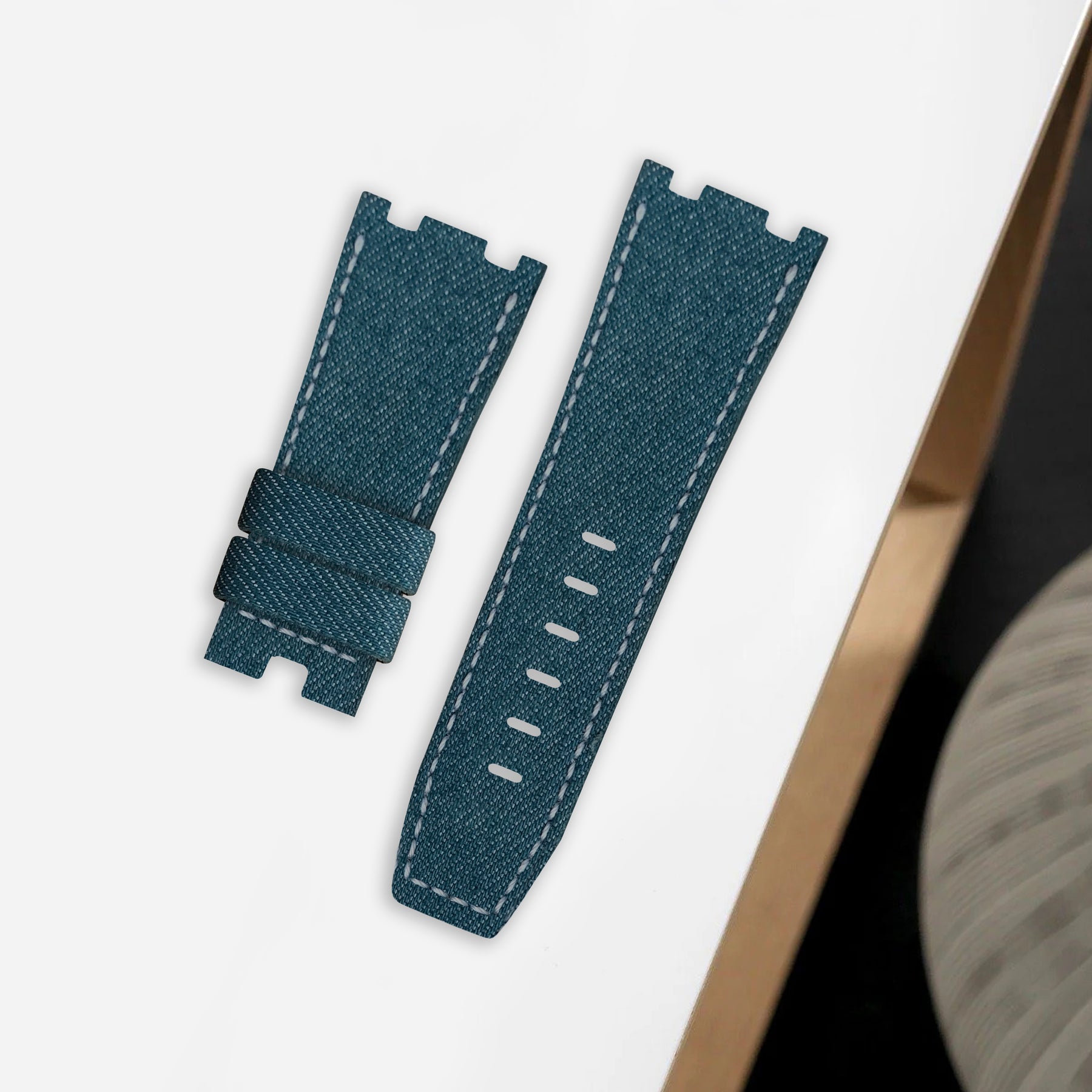 Japanese Denim Dry Teal brings contrast and clarity to your wrist. We use original Selvedge Denim from Japan’s most prestigious and renowned mills. It is woven on rare and slow antique looms to produce exceptional and fascinating textures for straps. Beyond its unique yarn combination, the denim's tight weave, stiff texture, pronounced twill lines and slightly coarse yarns create an exquisite surface structure and marbling effects with wear.