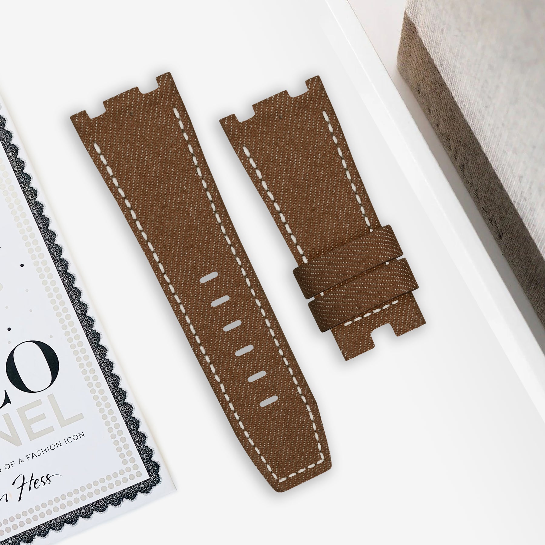 Japanese Denim Oakwood brings contrast and clarity to your wrist. We use original Selvedge Denim from Japan’s most prestigious and renowned mills. It is woven on rare and slow antique looms to produce exceptional and fascinating textures for straps. Beyond its unique yarn combination, the denim's tight weave, stiff texture, pronounced twill lines and slightly coarse yarns create an exquisite surface structure and marbling effects with wear.