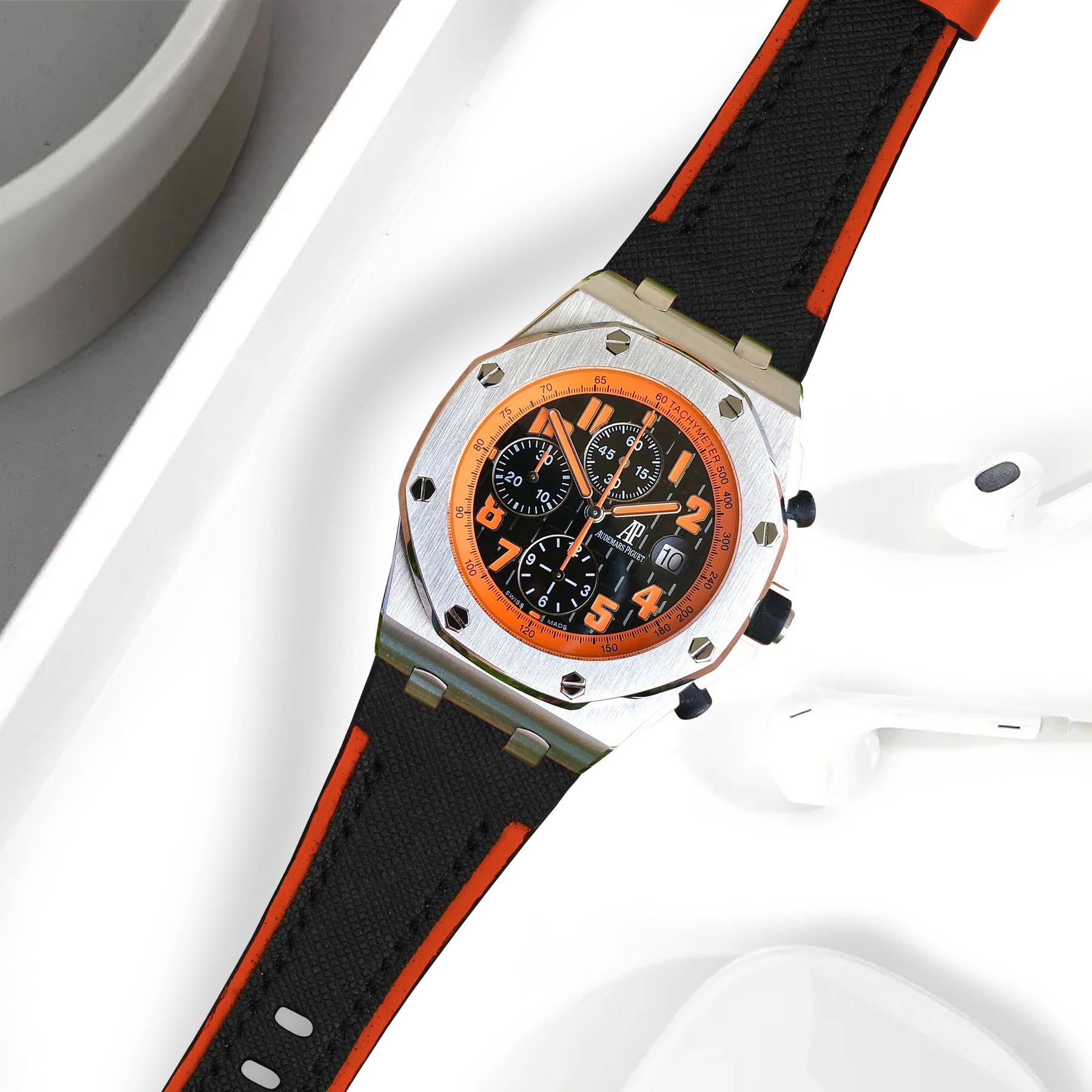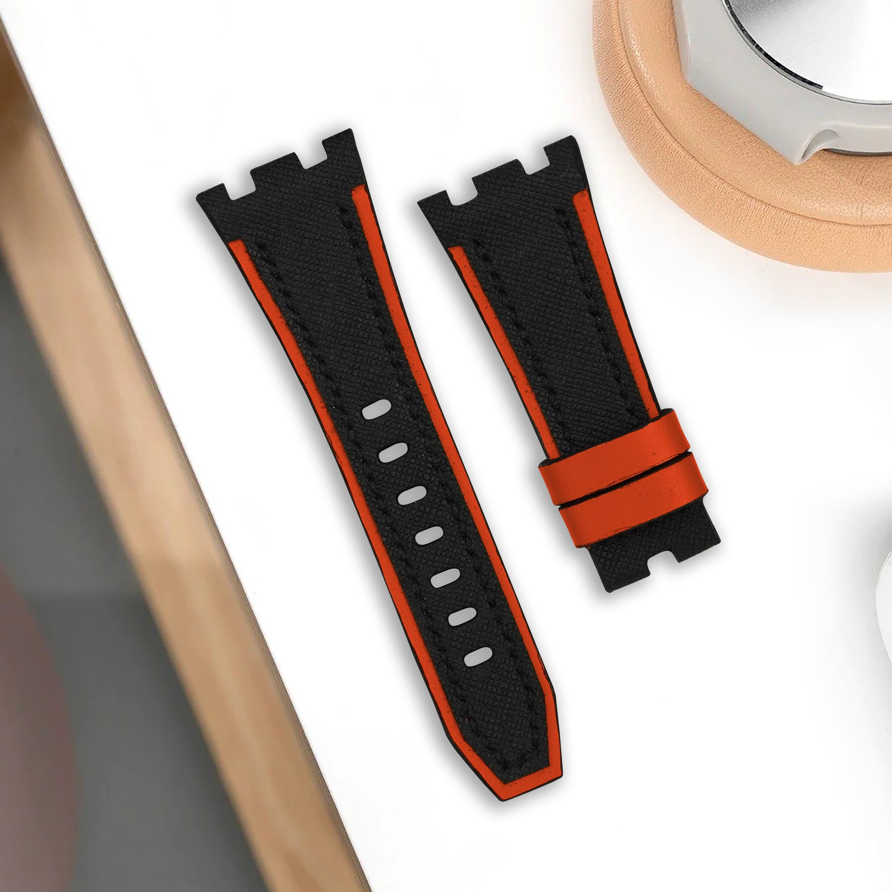 Designed for those who appreciate fine details, this strap features double-layered leather and a tapered silhouette, creating a sporty yet elegant look. Meticulously crafted from waterproof Saffiano leather, it ensures your watch stays pristine, whether you’re caught in a downpour or enjoying a weekend by the water. It’s lined with smooth orange calfskin for equal parts comfort and resilience.