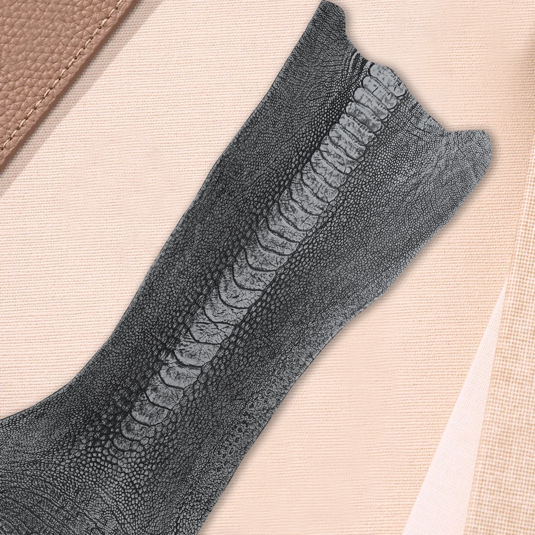 Description : Our Newly arrived Ostrich Leg Nubuck is a really great colour that will work really well on a number of watches with black and silver dial. It’s got a super soft hand and a wonderful nubuck finish.