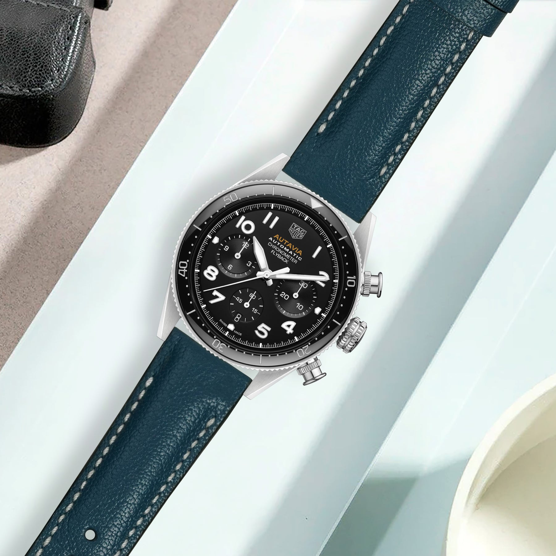 These newer models feature a simple pressure-button mechanism on the back of the strap near the attachment, it’s easy to hook and release the strap from the case. Made from French Goat leather with beautiful grained texture, excellent scratch and water resistance. Coming in a wide range of chevre leather colours material for your Autavia, you can choose the one that best suits your watch and outfit.