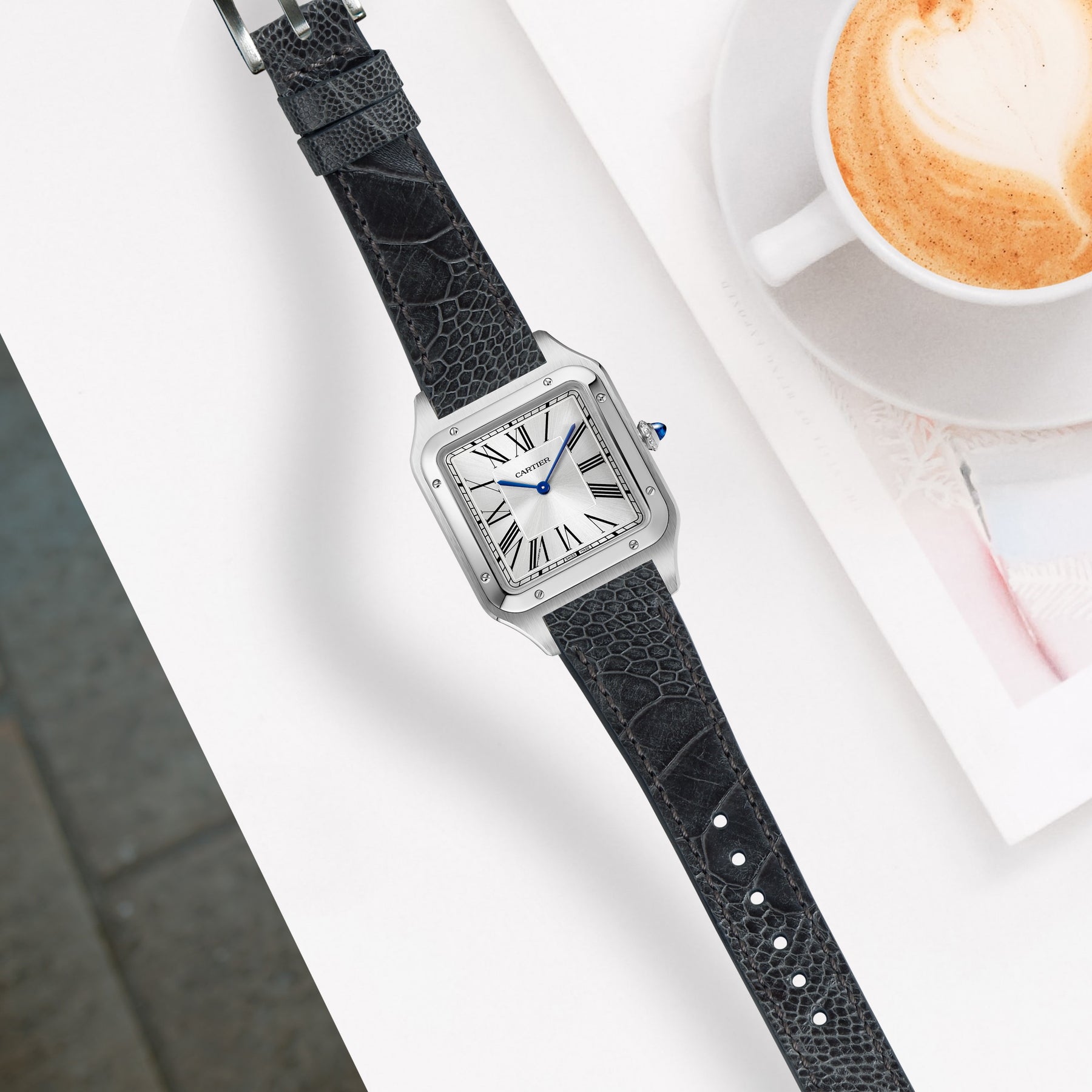 Description : Introducing the new addition to the Cartier Santos-Dumont collection. Genuine Ostrich Leg watch strap designed exclusively for Santos Dumont feature Quick-switch system using the same metal adapters and comes with a quick release spring bar to provide a flush fit for the Cartier Santos-Dumont without any lug overhang. Unlike the Santos line-up, this collection was made to only fit straps, not bracelets. With its slim case and classy look, it was a very dressy watch that worked well on a range of straps.
