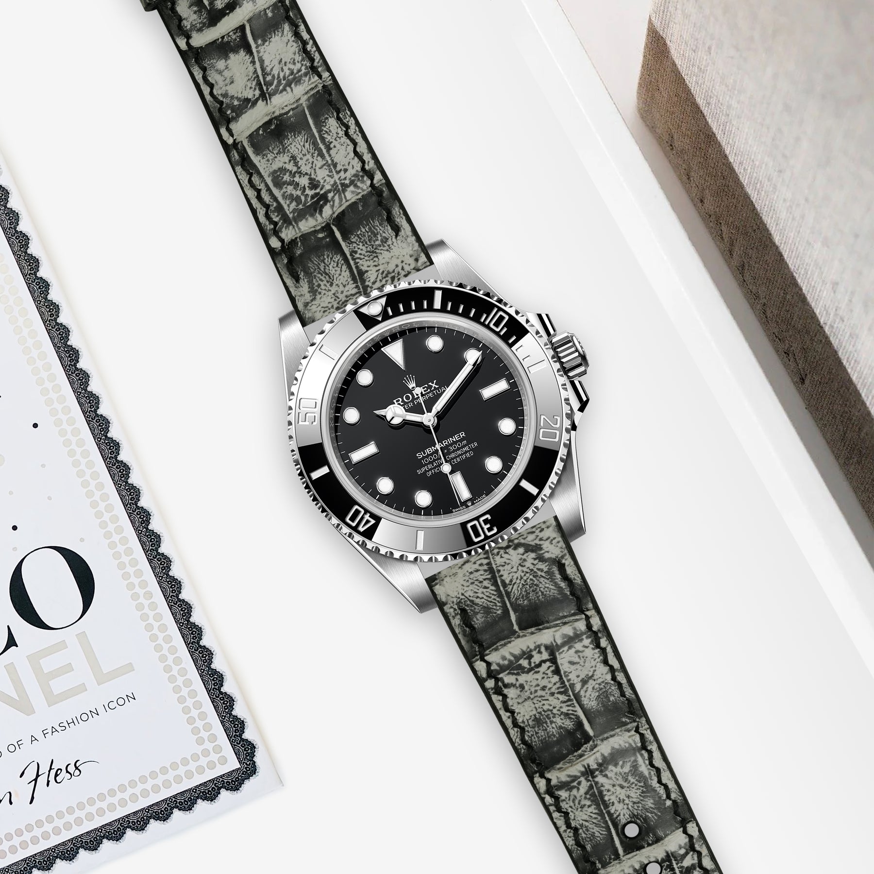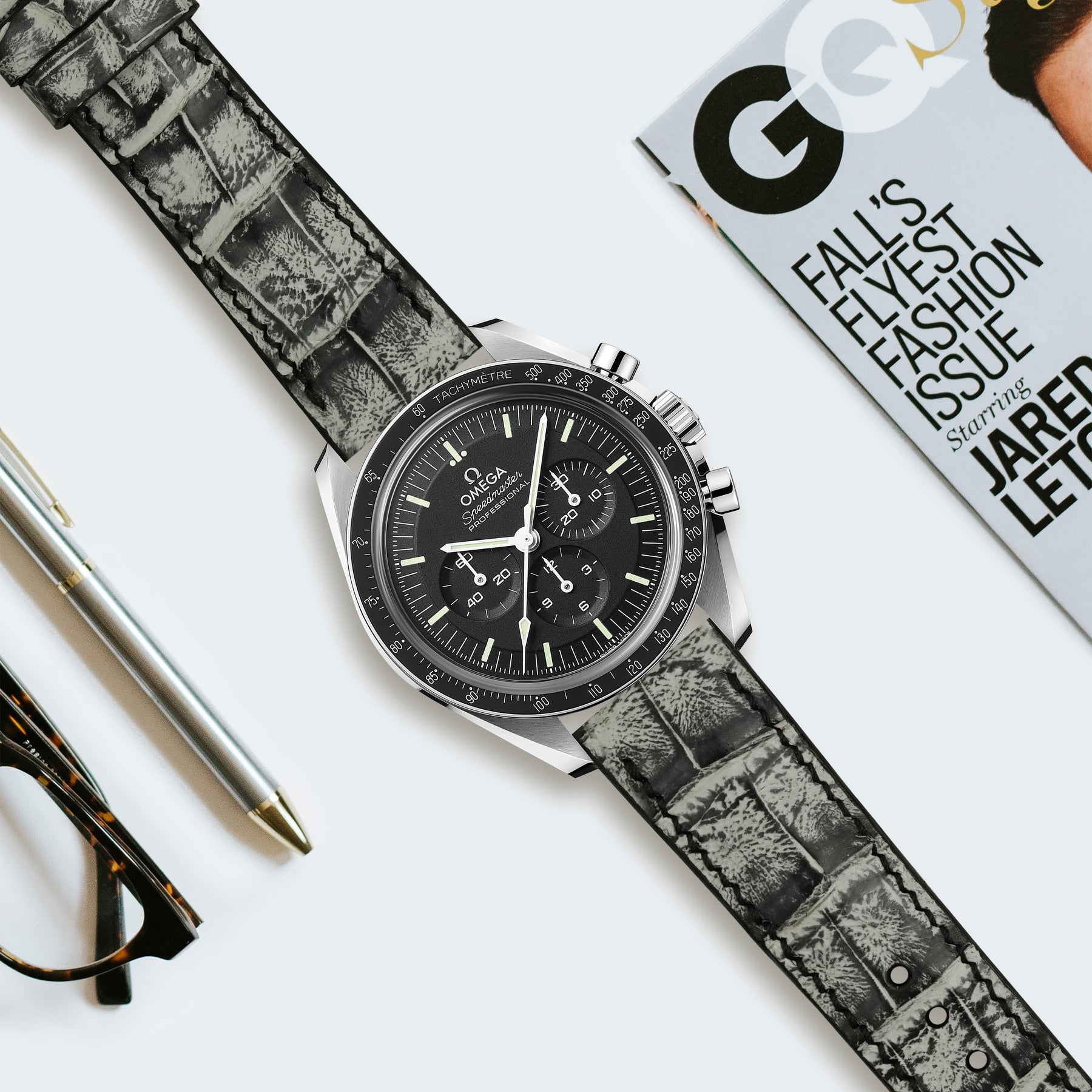 We’re always on the lookout for a special colour that is rare and unique and will make a statement on the wrist. This is a very special strap that’s been finished with a very special technique. Shades of black and ash white undertone create a real depth to the strap that makes it almost two dimensional.