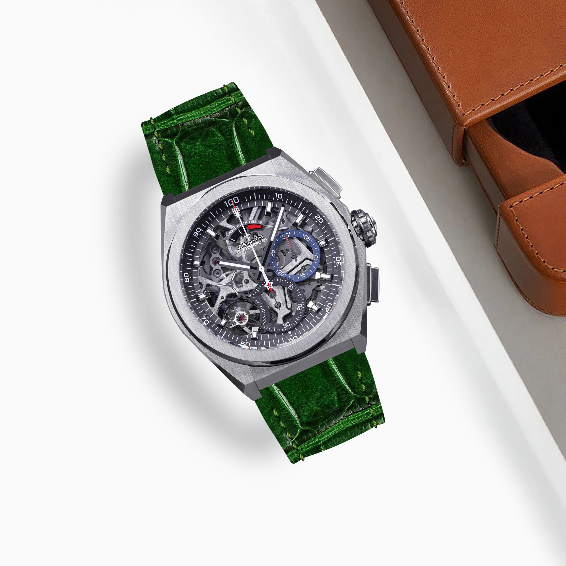 Description : Zenith Defy is built with a bold, futuristic architecture and we wanted our straps to reflect the same spirit — modern, technical and unmistakably refined. Crafted to our exact specifications and engineered to follow the unique dimensions of the Defy case, each strap features a seamless curved-end fit that sits perfectly against the watch, creating a clean, integrated look that feels as natural as the original design.