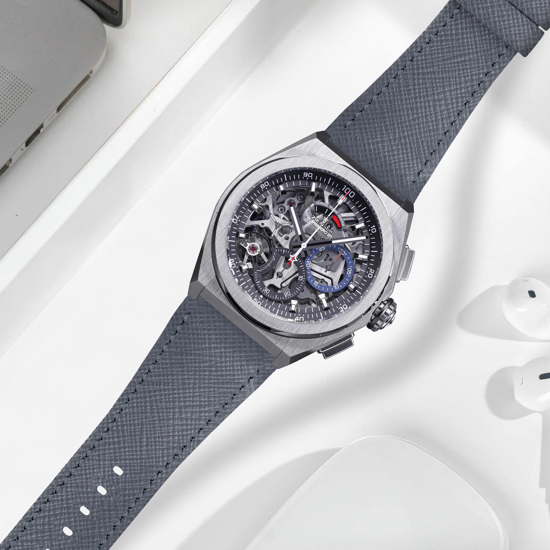 Description : Zenith Defy is built with a bold, futuristic architecture and we wanted our straps to reflect the same spirit — modern, technical and unmistakably refined. Crafted to our exact specifications and engineered to follow the unique dimensions of the Defy case, each strap features a seamless curved-end fit that sits perfectly against the watch, creating a clean, integrated look that feels as natural as the original design.