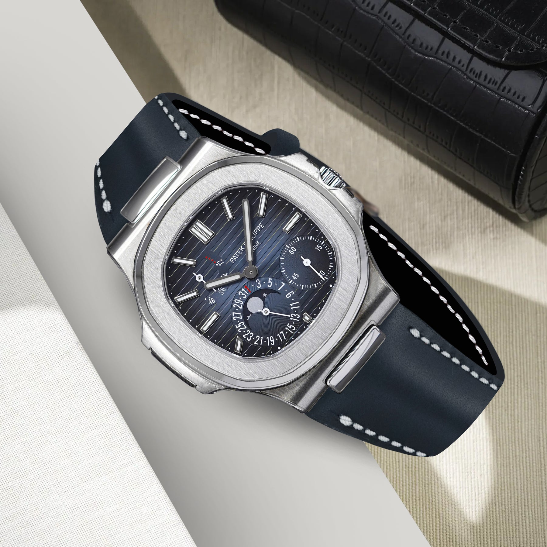 Description : Introducing the new addition to the Patek Philippe - Nautilus collection. Cordovan leather watch strap specially designed by our workshop to fit and highlight the nature of your Patek Philippe Nautilus without any lug overhang. With its slim case and classy look, it was a very dressy watch that worked well on a range of straps equiped with metal inserts for more durability.