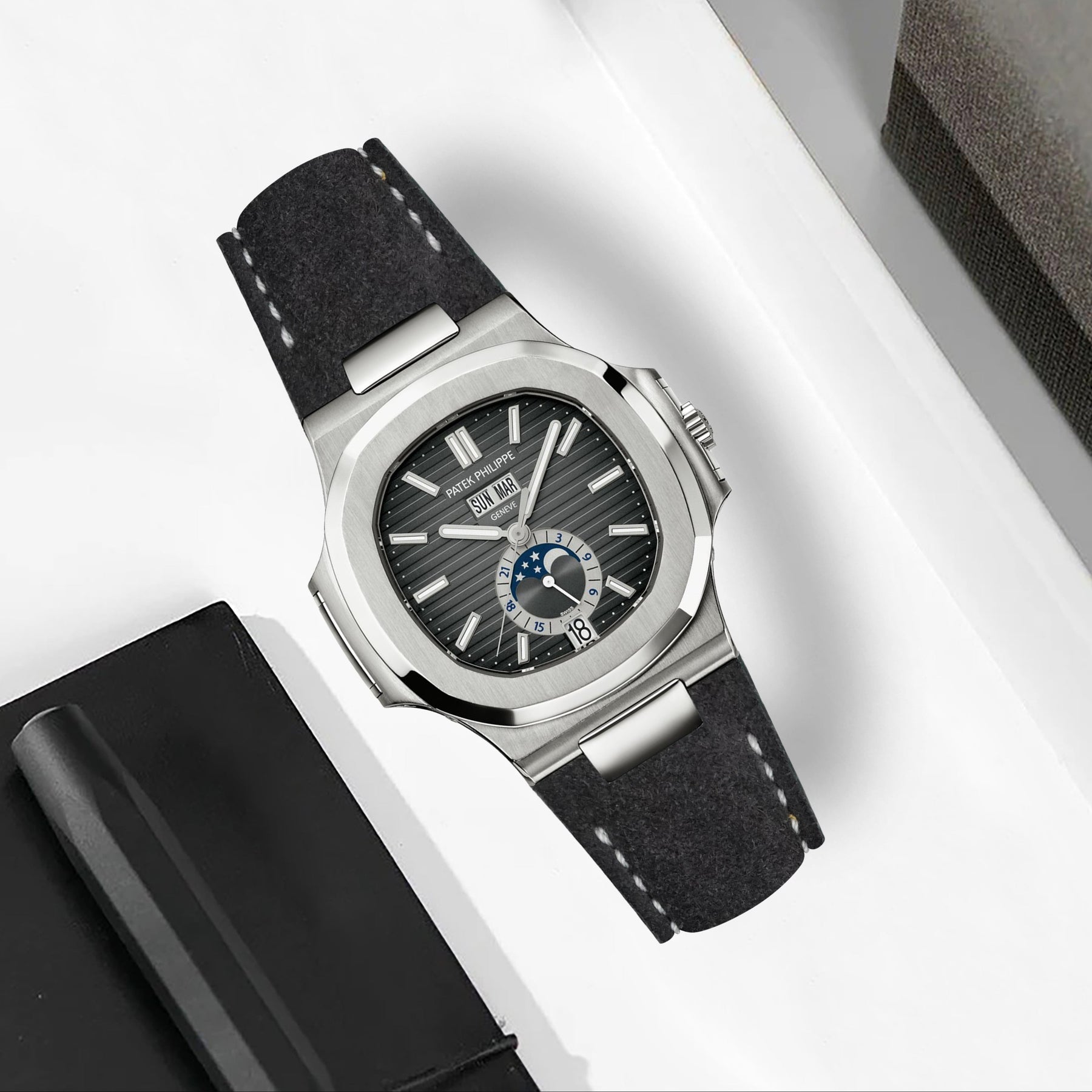 Description : Introducing the new addition to the Patek Philippe - Nautilus collection. Suede leather watch strap specially designed by our workshop to fit and highlight the nature of your Patek Philippe Nautilus without any lug overhang. With its slim case and classy look, it was a very dressy watch that worked well on a range of straps equiped with metal inserts for more durability.