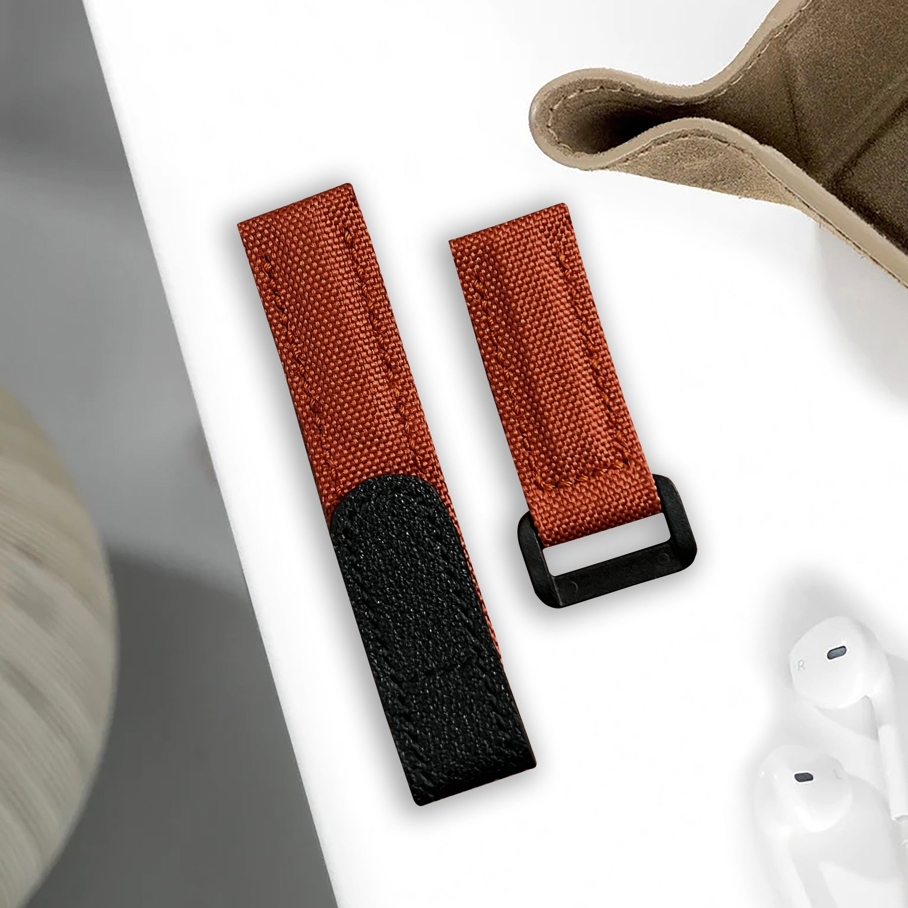 Material : Double-layered, stitched, durable Canvas leather strap in Bourbon with an adjustable hook and loop velcro closure in Calf leather Black.