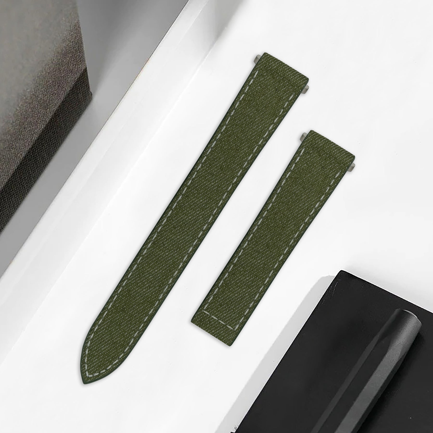 Japanese Denim Moss brings contrast and clarity to your wrist. We use original Selvedge Denim from Japan’s most prestigious and renowned mills. It is woven on rare and slow antique looms to produce exceptional and fascinating textures for straps. Beyond its unique yarn combination, the denim's tight weave, stiff texture, pronounced twill lines and slightly coarse yarns create an exquisite surface structure and marbling effects with wear.