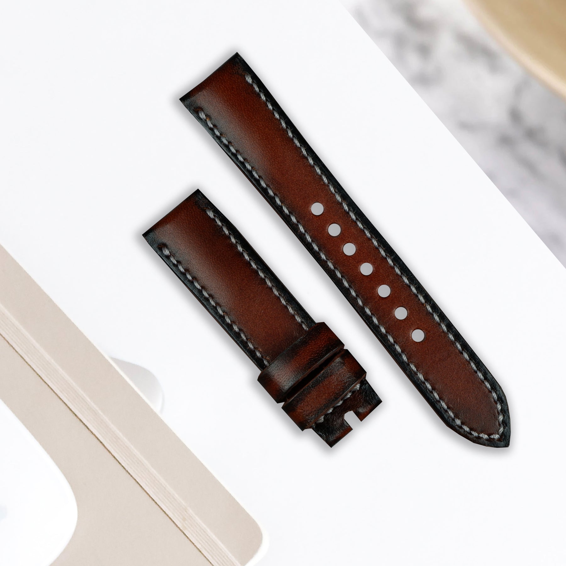 The colour is incredibly versatile and is equally at home on white dialled or black dialled watches. We've used an off silver silk linen thread to finish the strap. The classic stitch lifts the strap and helps frame the watch it's fitted to.