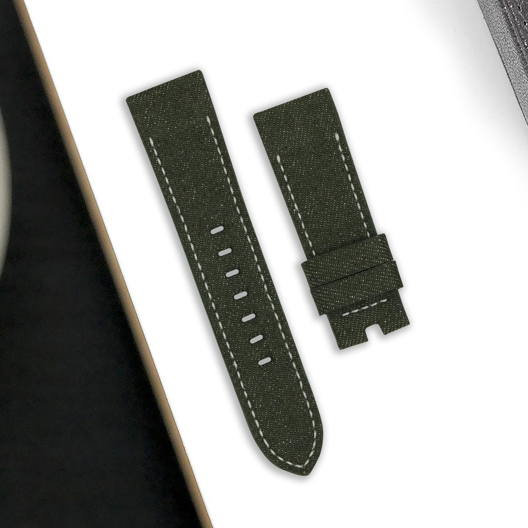 Japanese Denim Oak Green brings contrast and clarity to your wrist. We use original Selvedge Denim from Japan’s most prestigious and renowned mills. features white stitching, features with simple pressure applied on the button on the back of the strap near the attachment, it’s easy to hook and release the strap from the case. It is woven on rare and slow antique looms to produce exceptional and fascinating textures for straps. Beyond its unique yarn combination, the denim's tight weave, stiff texture, pronounced twill lines and slightly coarse yarns create an exquisite surface structure and marbling effects with wear.