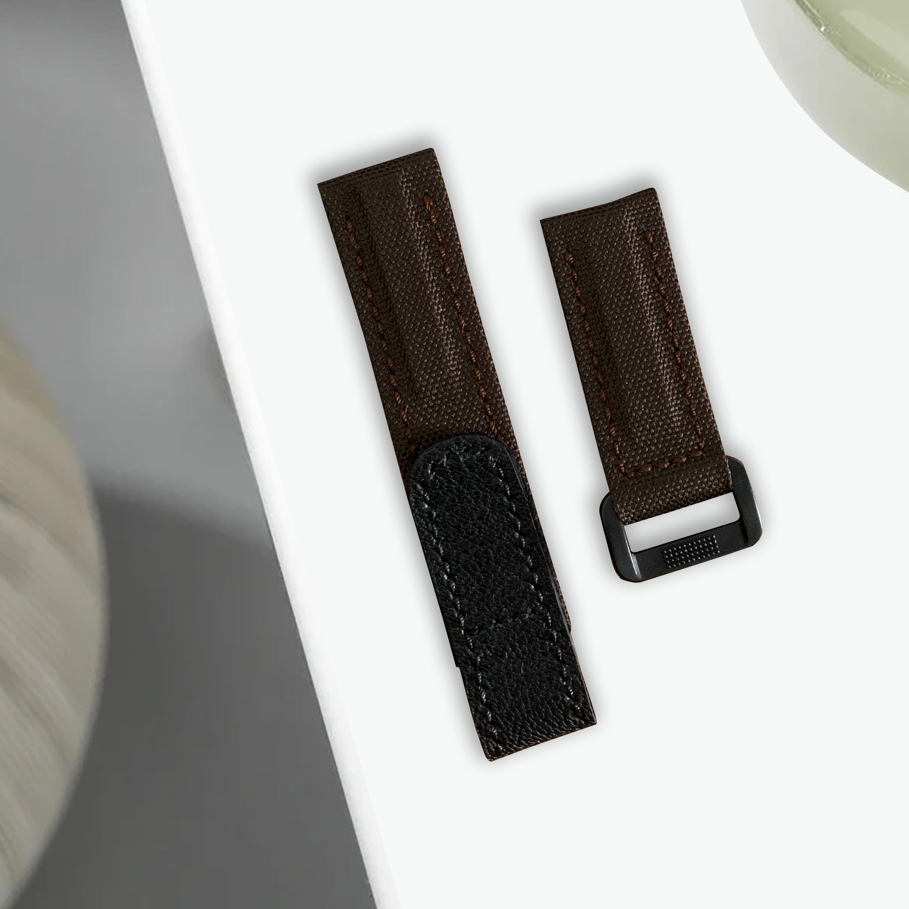 Material : Double-layered, stitched, durable Canvas leather strap in Brown with an adjustable hook and loop velcro closure in Calf leather Black. Also the soft hypoallergenic leather lining for exceptional all-day comfort, and durability.