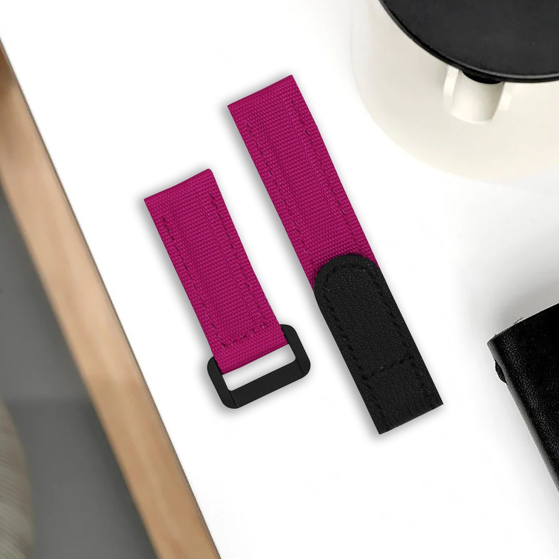 Material : Double-layered, stitched, durable Canvas leather strap in Ruby with an adjustable hook and loop velcro closure in Calf leather Black. Also the soft hypoallergenic leather lining for exceptional all-day comfort, and durability.