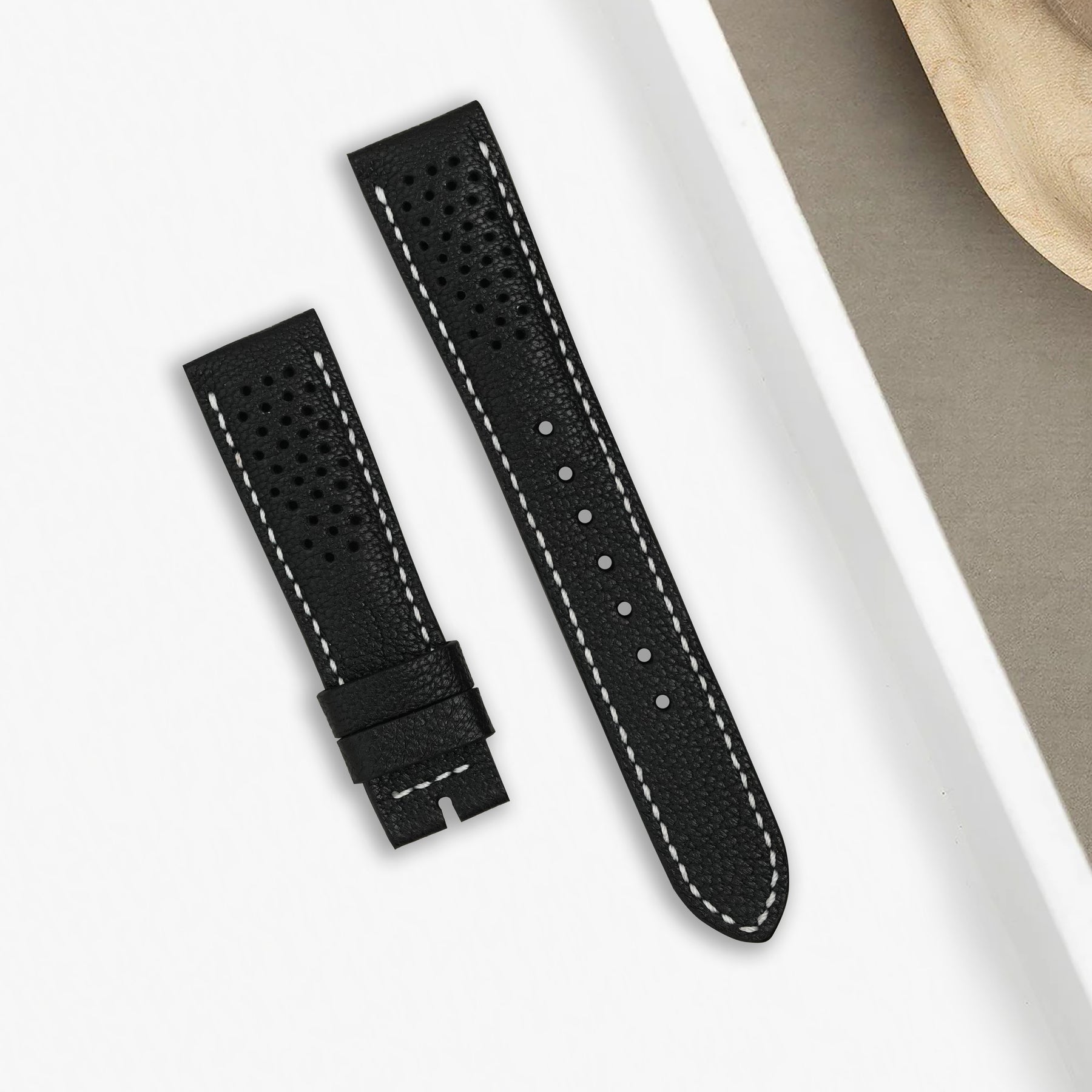Description : Inspired by the sporty times of the 70’s, these racing straps are an essential to make any sport watch look even cooler. The holes make the strap lighter and more breathable, ideal for warm conditions where you want the comfy feel of a leather strap but don’t want the whole leather feel.