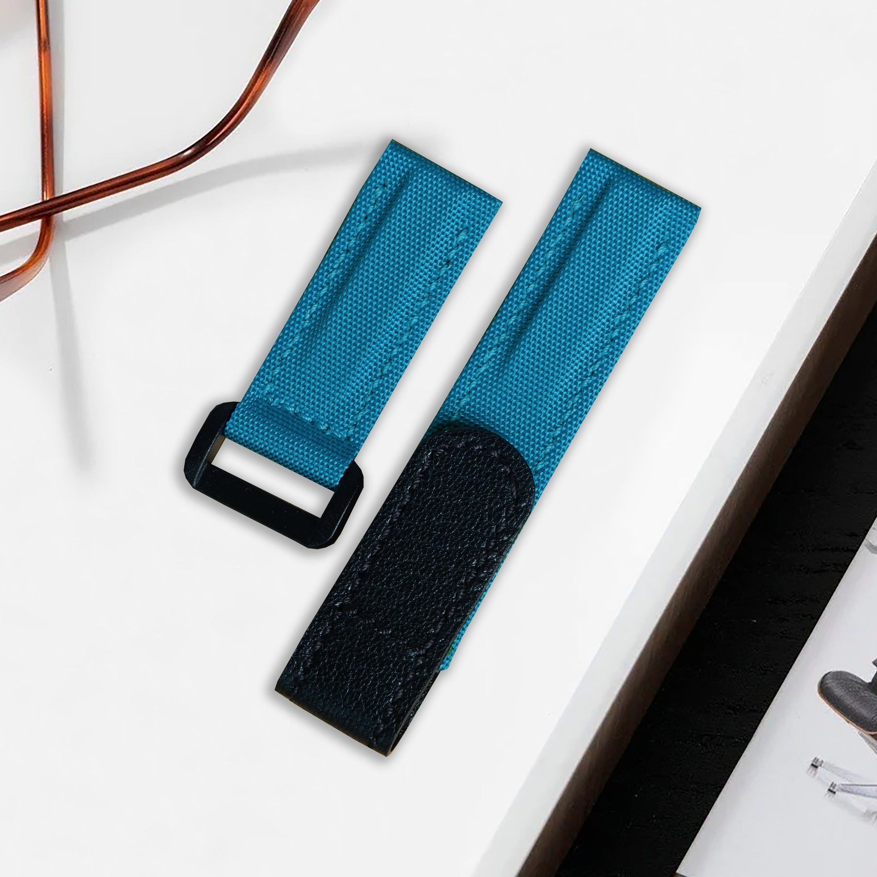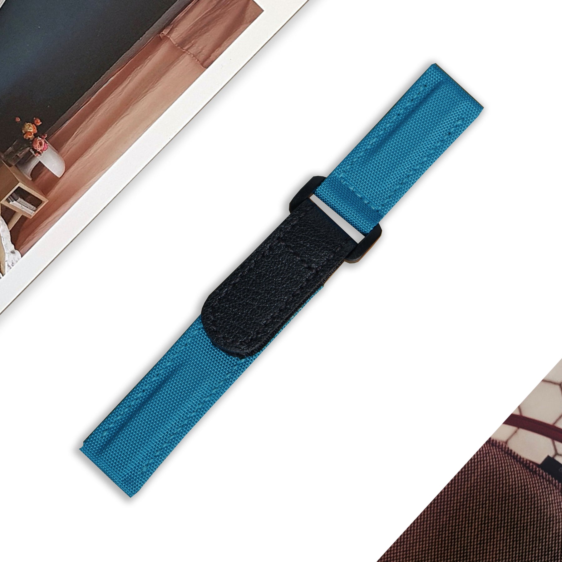 Material : Double-layered, stitched, durable Canvas leather strap in Cyan with an adjustable hook and loop velcro closure in Calf leather Black. Also the soft hypoallergenic leather lining for exceptional all-day comfort, and durability.
