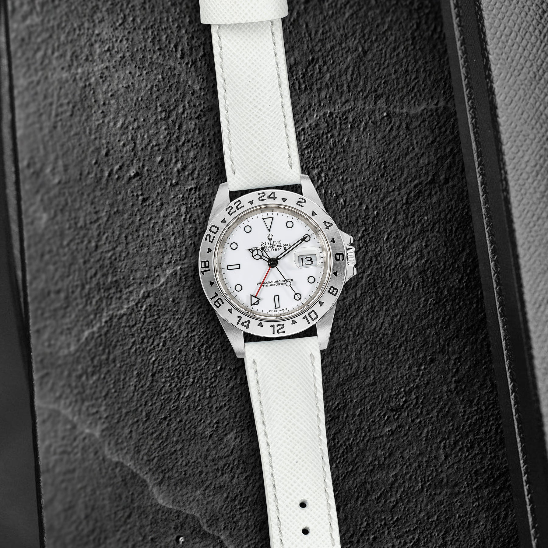 Our White Saffiano is the one strap for all your needs. The watch strap deals well with water, scratches and is also easy to care for and can be cleaned with a simple wipe using a damp cloth.