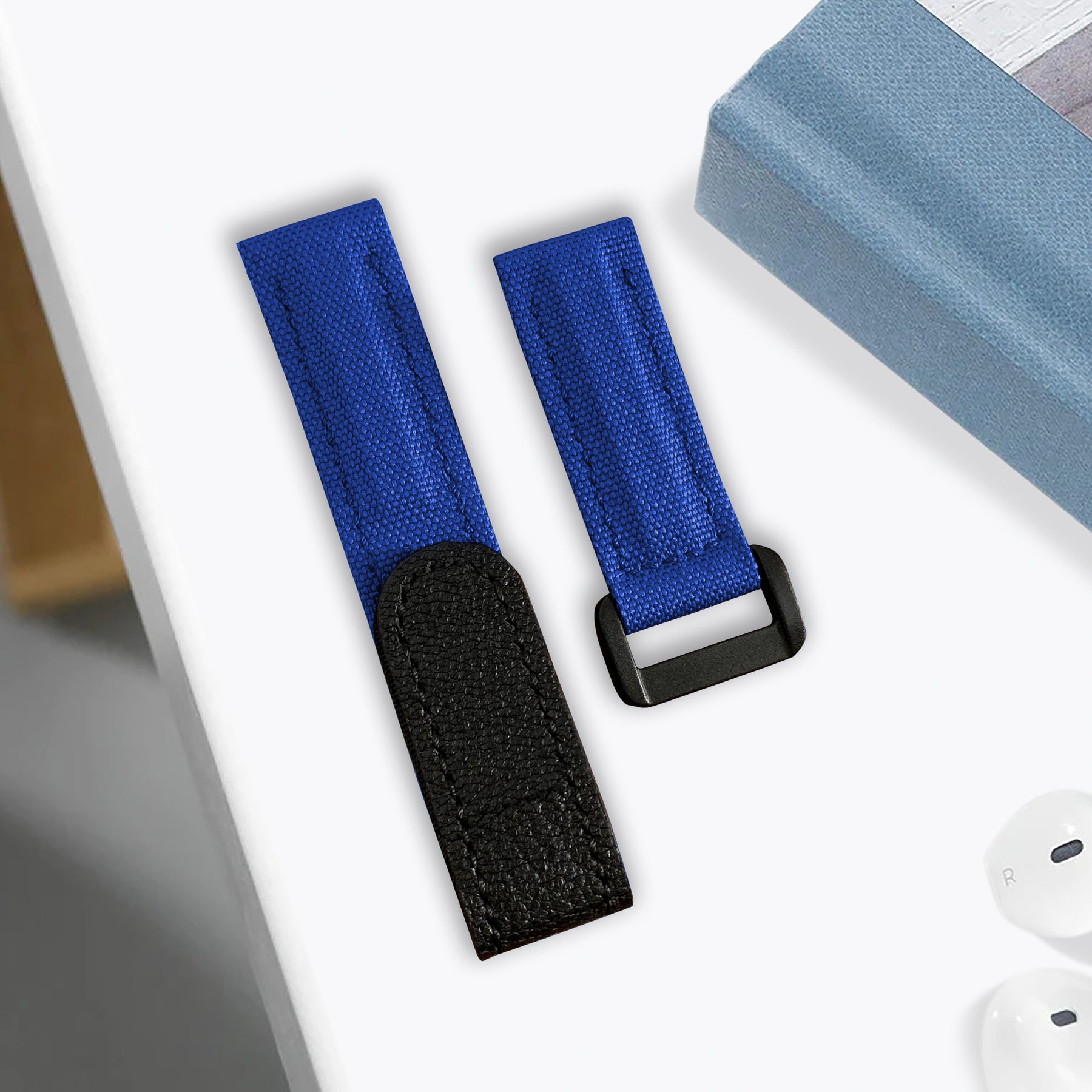 Material : Double-layered, stitched, durable Canvas leather strap in Blue with an adjustable hook and loop velcro closure in Calf leather Black. Also the soft hypoallergenic leather lining for exceptional all-day comfort, and durability.