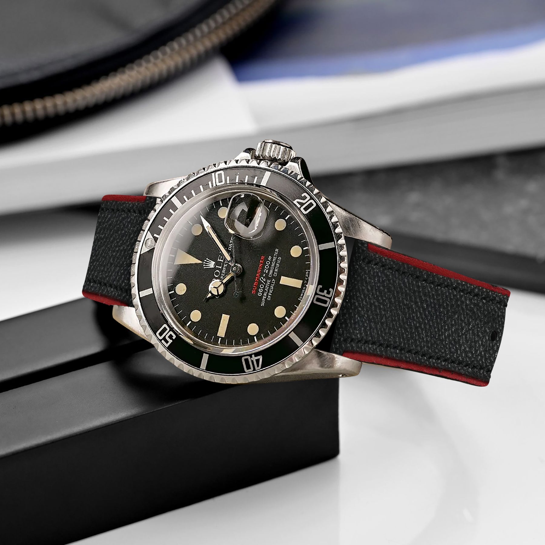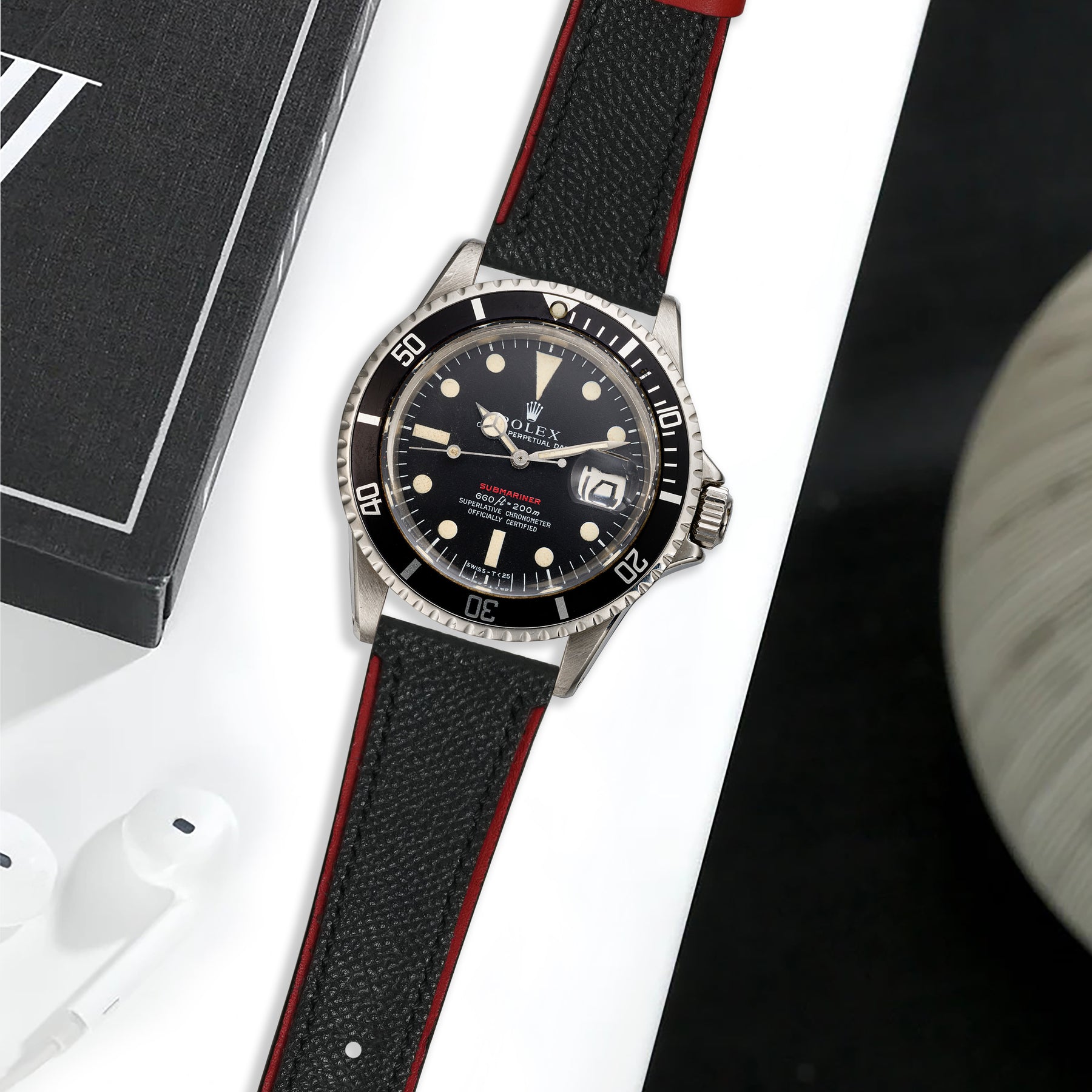 Meticulously crafted from waterproof Saffiano leather, it ensures your watch stays pristine, whether you’re caught in a downpour or enjoying a weekend by the water. It’s lined with smooth red calfskin for equal parts comfort and resilience.