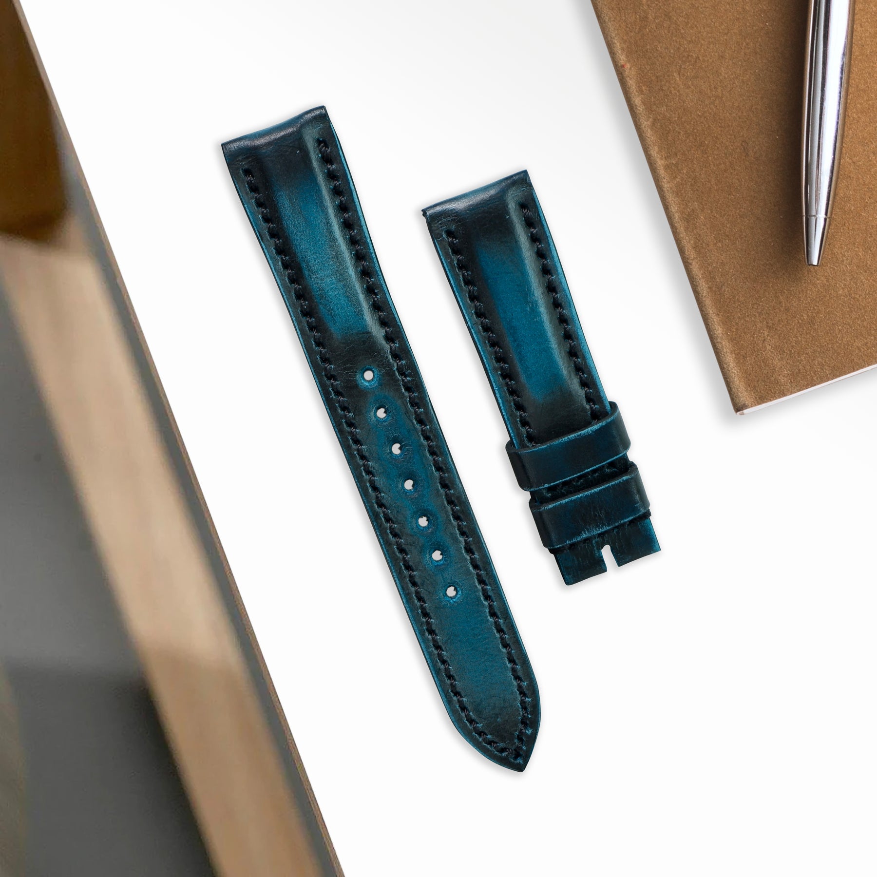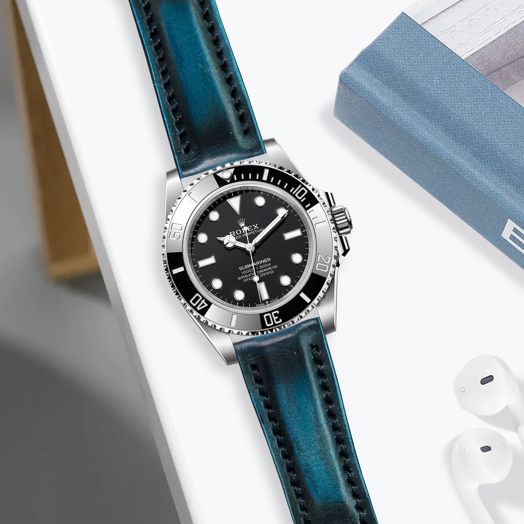 Description : The Wraith Serie is a strap unique to each individual wearer. The Black wax on the leather will work it way through forming patina and revealing the Blue over time.