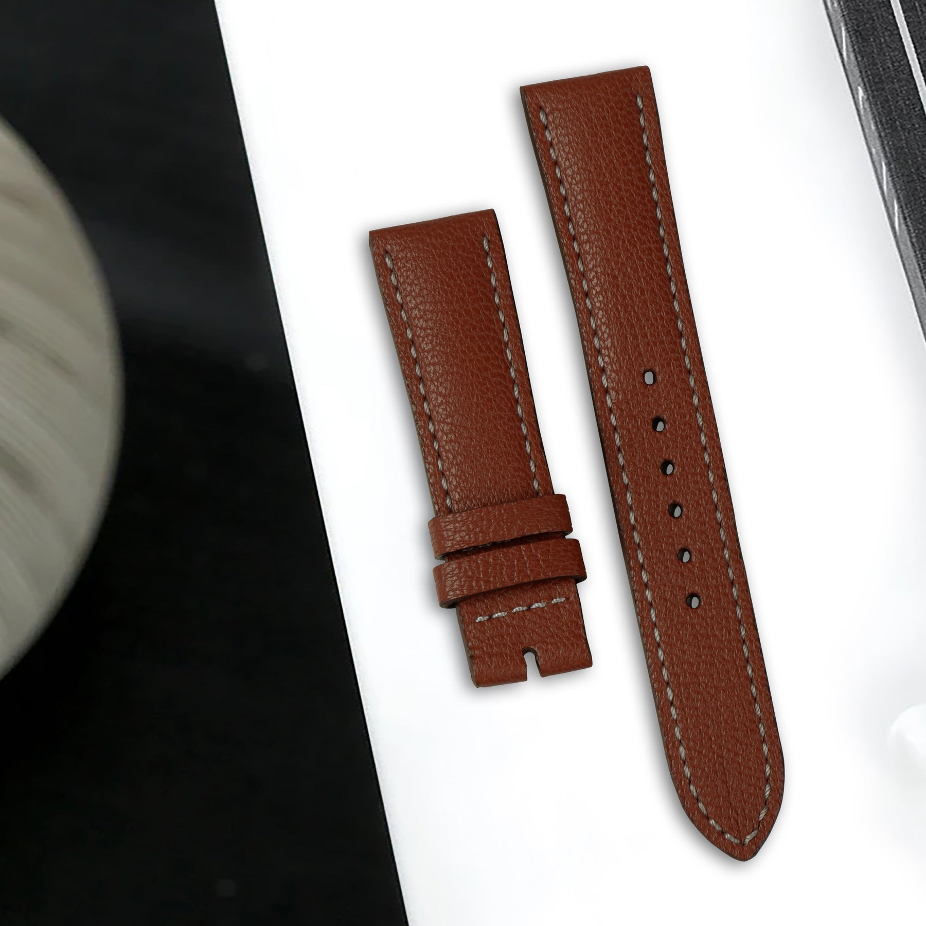 Chevre is immediately recognisable from its texture and grain. A smooth surface and a slight gloss immediately imparts luxuriousness to products made with this leather. Not only a feast for the eyes, chevre is also strongly water and scratch-resistant, and is a great option for daily wear watch straps.