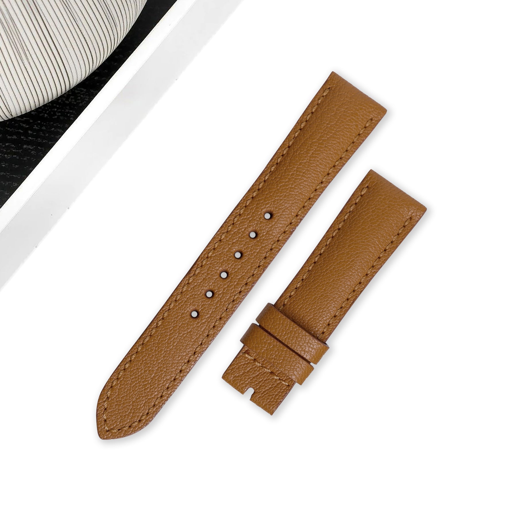 Chevre is immediately recognisable from its texture and grain. A smooth surface and a slight gloss immediately imparts luxuriousness to products made with this leather. Not only a feast for the eyes, chevre is also strongly water and scratch-resistant, and is a great option for daily wear watch straps.
