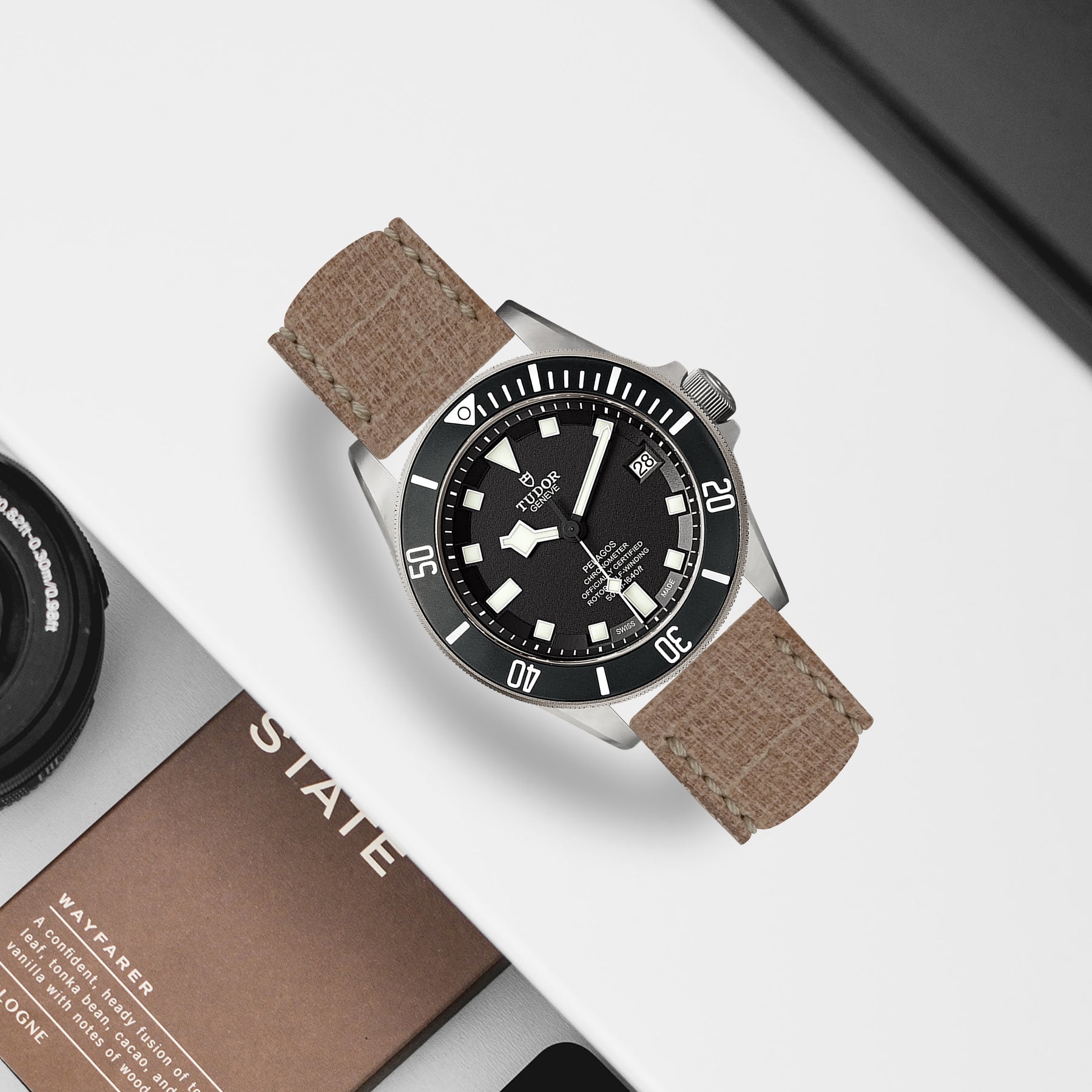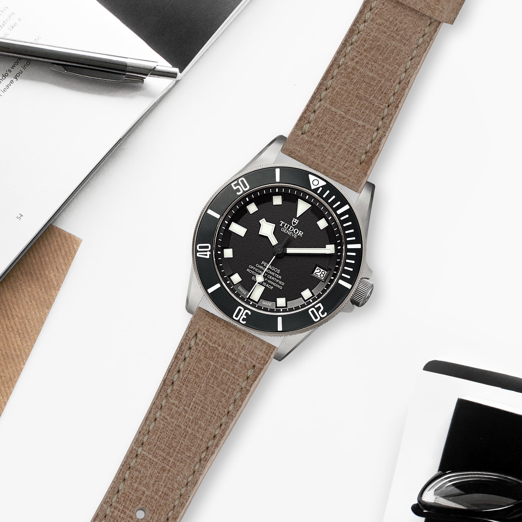 Description : Introducing our Ospro serie, a great casual strap that works well for an array of occasions. At first glance, the eye-catching texture reminds you of linen fabric. However, it’s a vegetable tanned leather coated with a light layer of wax and the leather is etched to create a linen-like surface. The leather surface varies from smooth and grained, with some areas of the hide containing a light pebbled grain underneath the linen-look. The resulting effect is a touch of rugged elegance that seamlessly suits both casual and formal ensembles.
