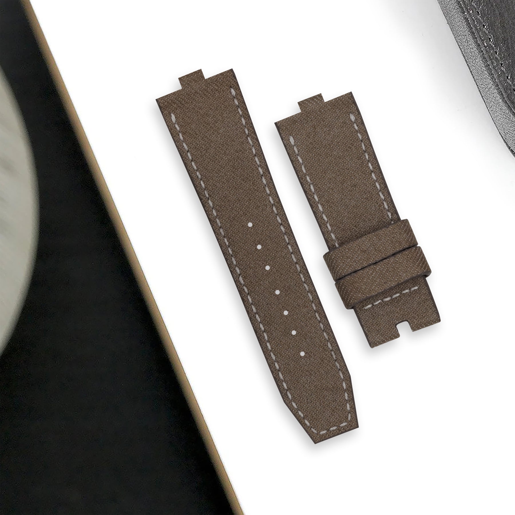 Japanese Denim Taupe brings contrast and clarity to your wrist. We use original Selvedge Denim from Japan’s most prestigious and renowned mills. It is woven on rare and slow antique looms to produce exceptional and fascinating textures for straps. Beyond its unique yarn combination, the denim's tight weave, stiff texture, pronounced twill lines and slightly coarse yarns create an exquisite surface structure and marbling effects with wear.