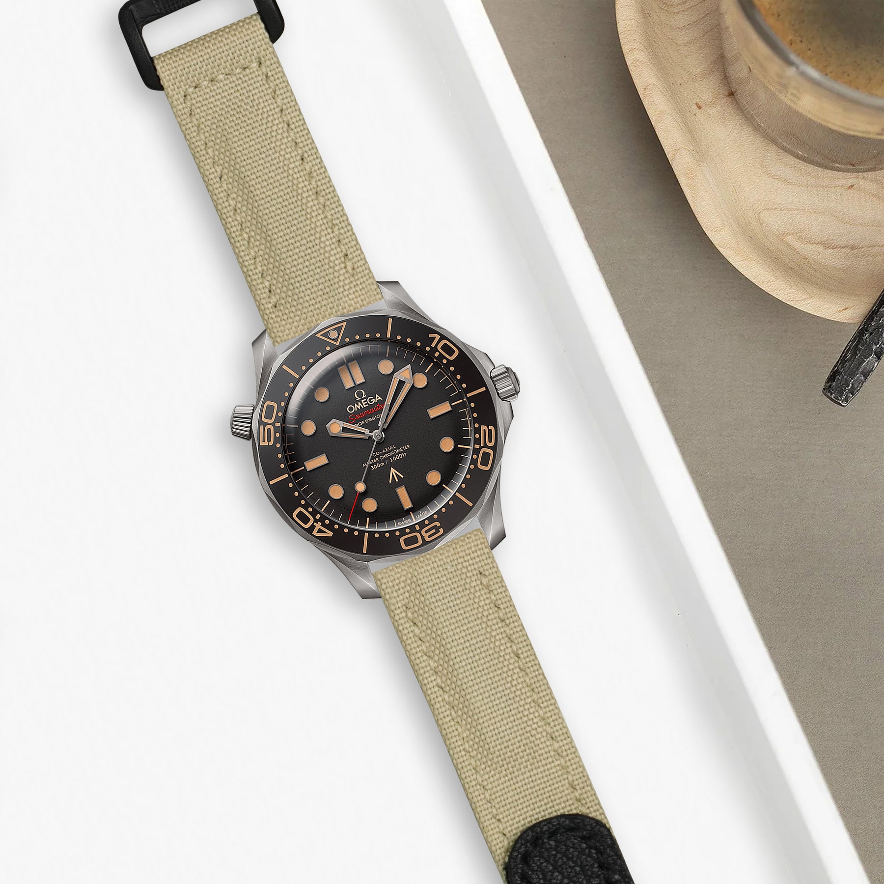 Material : Double-layered, stitched, durable Canvas leather strap in Beige with an adjustable hook and loop velcro closure in Calf leather Black. Also the soft hypoallergenic leather lining for exceptional all-day comfort, and durability.