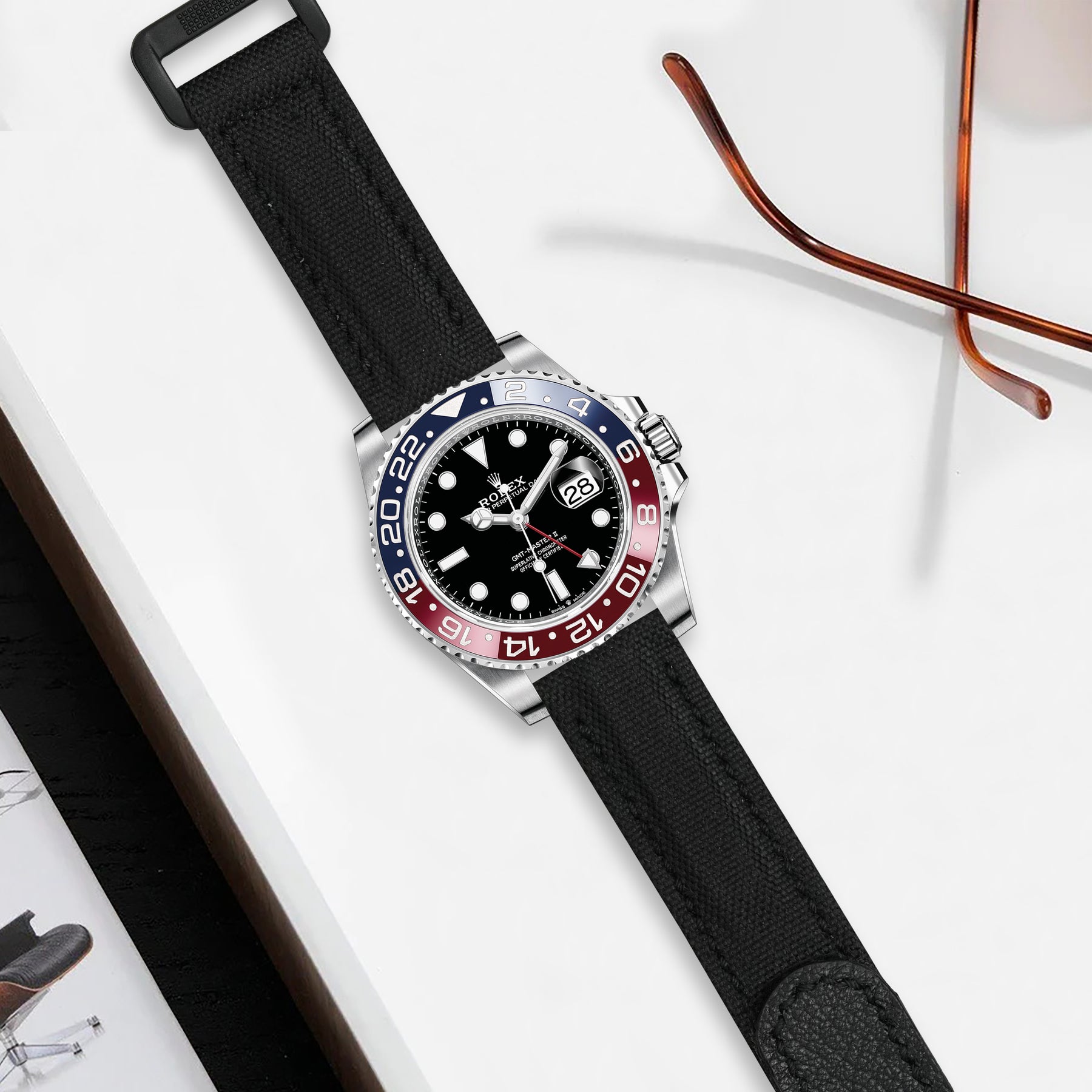 Material : Double-layered, stitched, durable Canvas leather strap in Black with an adjustable hook and loop velcro closure in Calf leather Black. Also the soft hypoallergenic leather lining for exceptional all-day comfort, and durability.