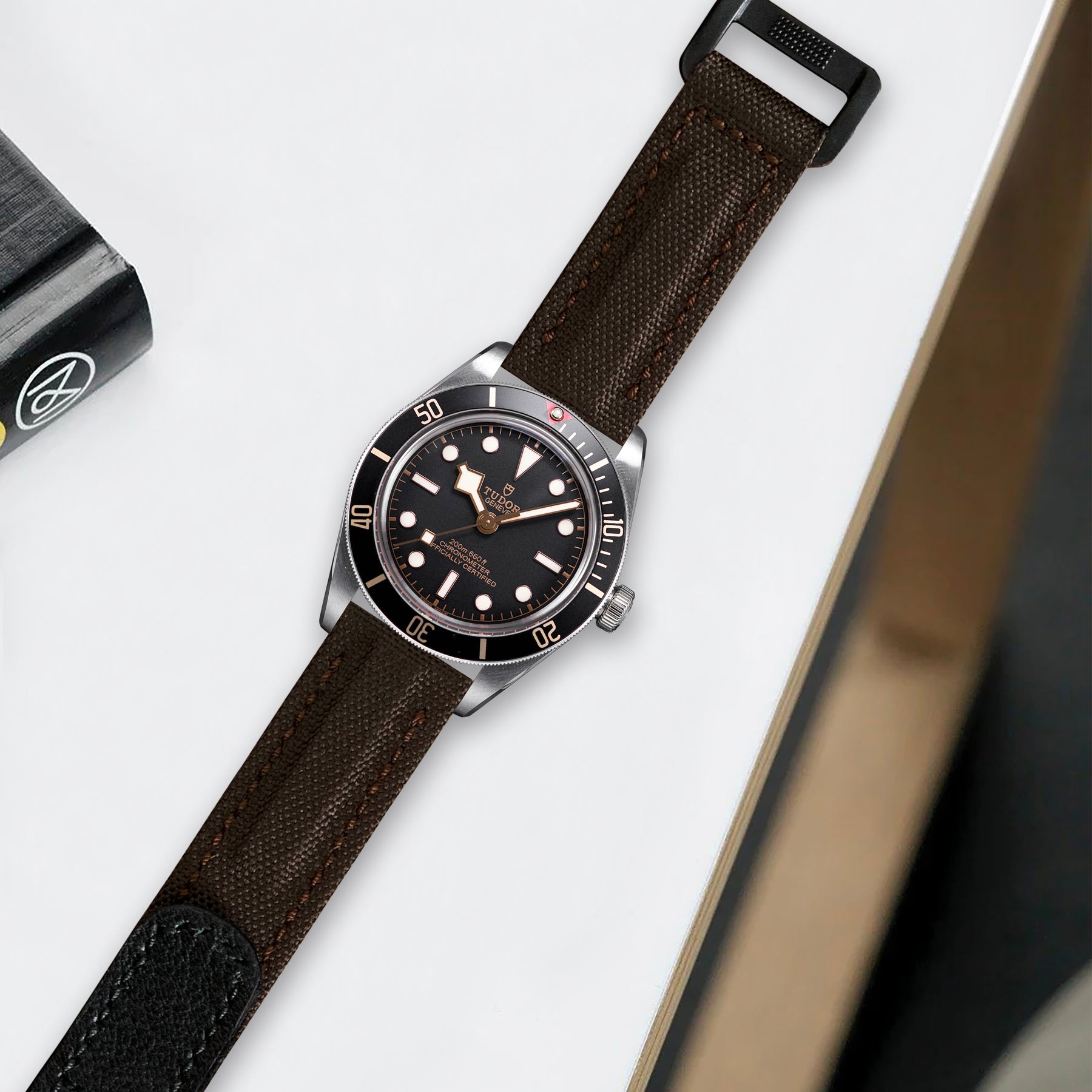 Material : Double-layered, stitched, durable Canvas leather strap in Brown with an adjustable hook and loop velcro closure in Calf leather Black. Also the soft hypoallergenic leather lining for exceptional all-day comfort, and durability.