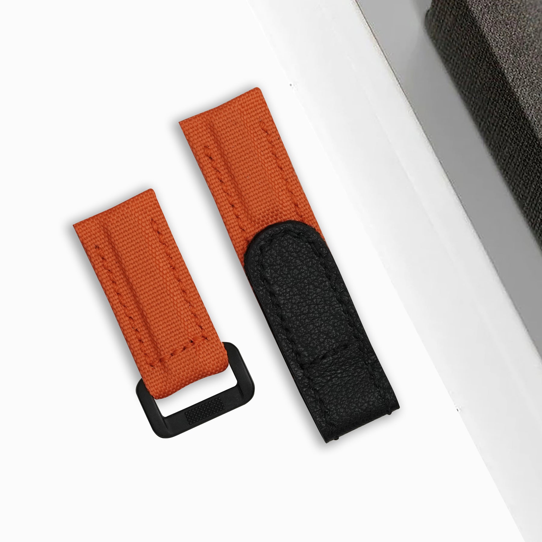 Material : Double-layered, stitched, durable Canvas leather strap in Orange with an adjustable hook and loop velcro closure in Calf leather Black. Also the soft hypoallergenic leather lining for exceptional all-day comfort, and durability.