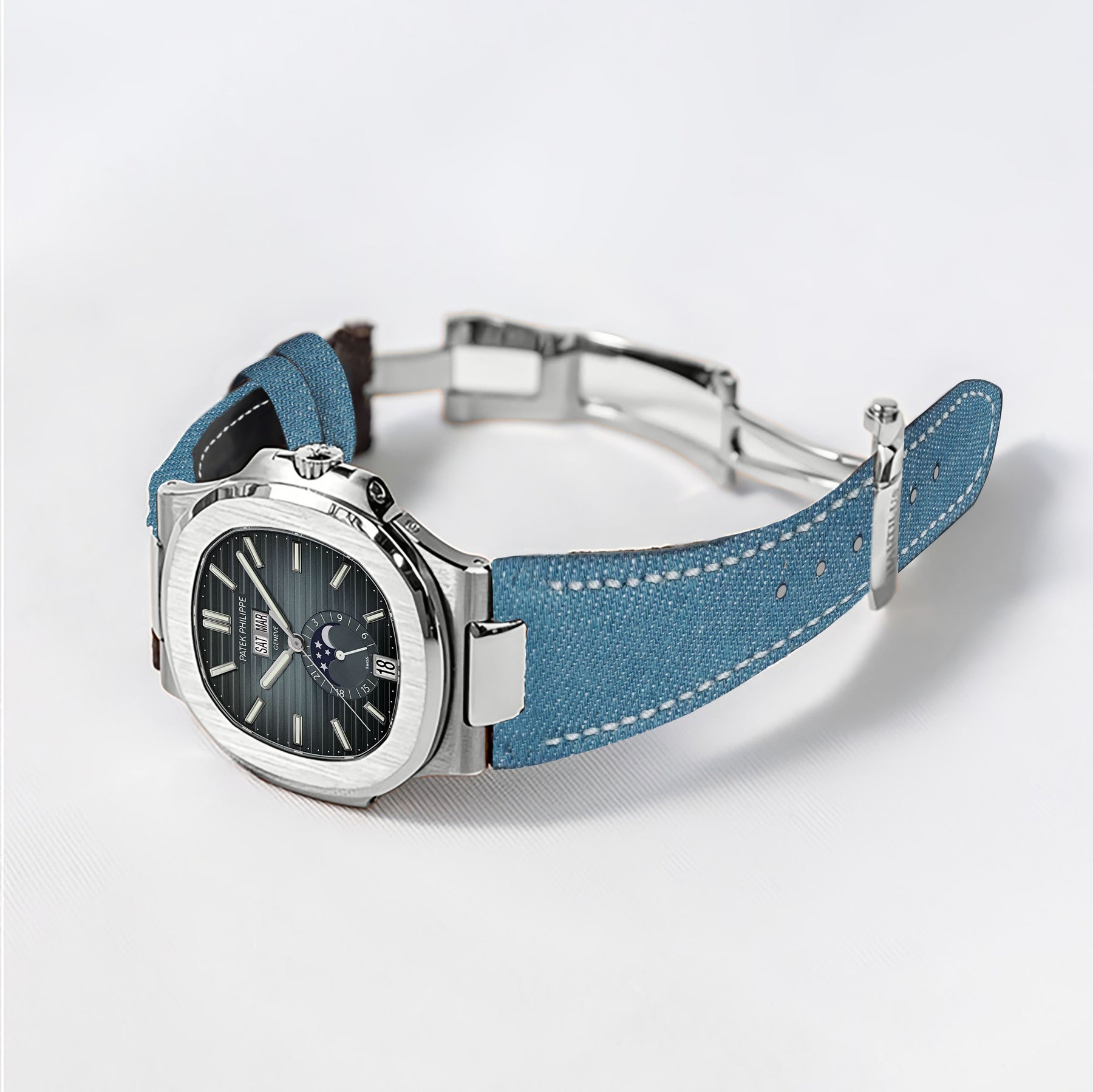 Description : Introducing the new addition to the Patek Philippe - Nautilus collection. Denim Blue Rebel specially designed by our workshop to fit and highlight the nature of your Patek Philippe Nautilus without any lug overhang. With its slim case and classy look, it was a very dressy watch that worked well on a range of straps equiped with metal inserts for more durability.