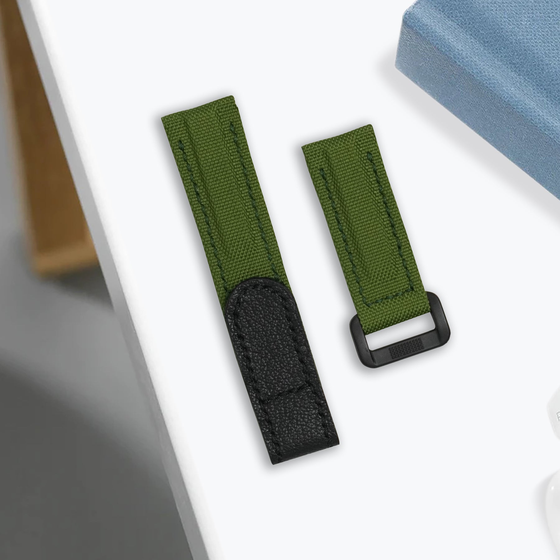 Material : Double-layered, stitched, durable Canvas leather strap in Green with an adjustable hook and loop velcro closure in Calf leather Black. Also the soft hypoallergenic leather lining for exceptional all-day comfort, and durability.