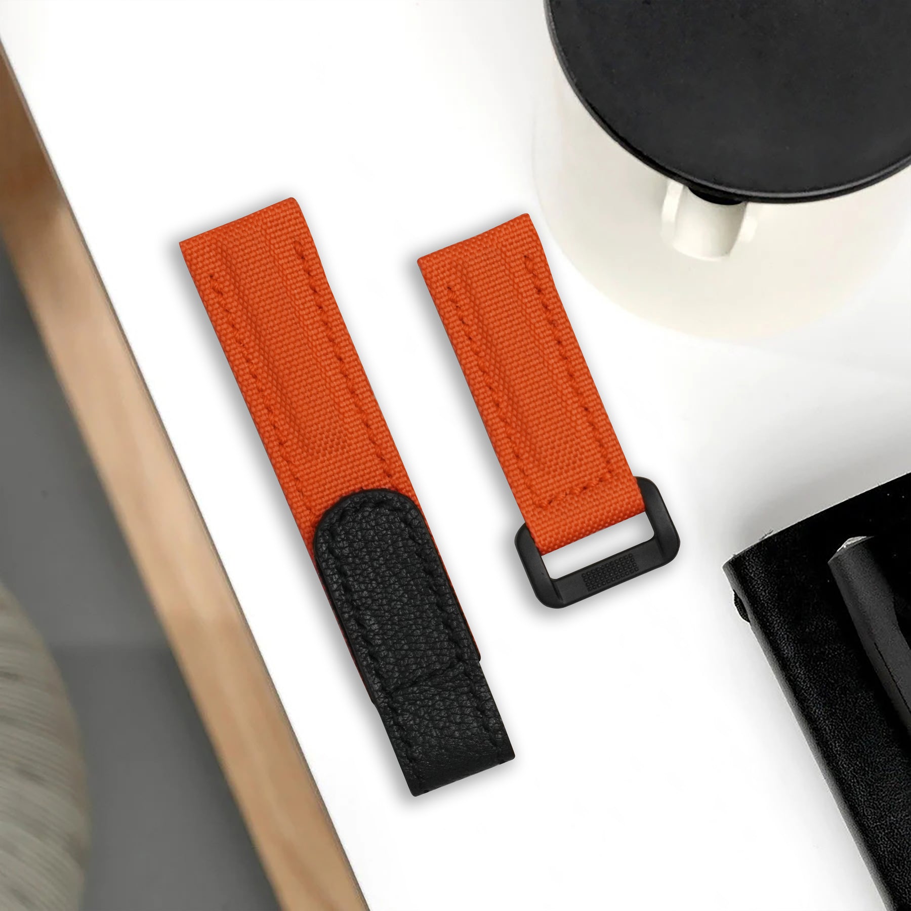 Material : Double-layered, stitched, durable Canvas leather strap in Orange with an adjustable hook and loop velcro closure in Calf leather Black. Also the soft hypoallergenic leather lining for exceptional all-day comfort, and durability.